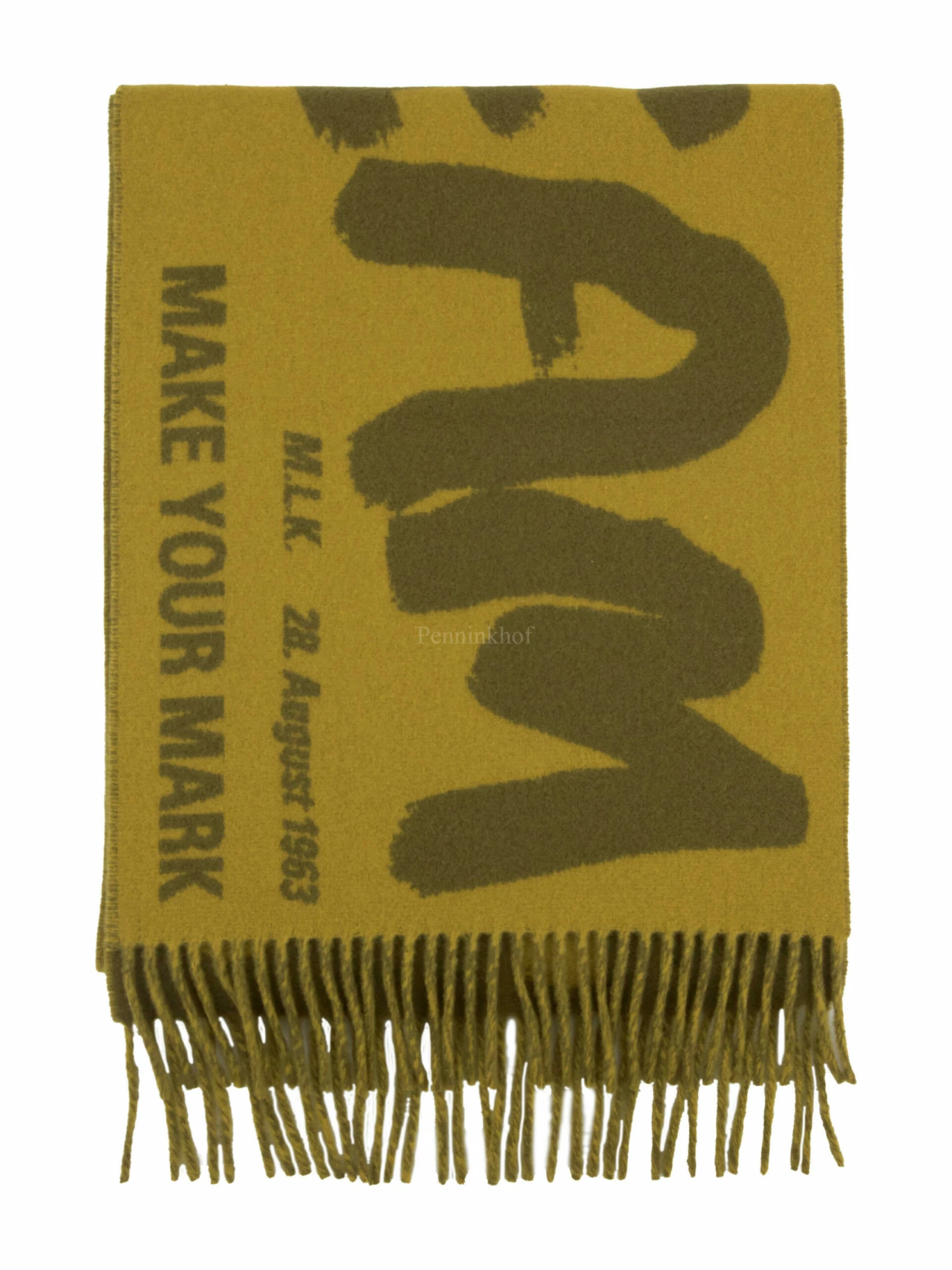 Een shawl van Annette Görtz met een text print in de kleuren lichtgrijs en okergeel. Aan de uiteinden van de shawl zijn lange franjes. Deze shawl mag niet worden gewassen.A scarf from Annette Görtz featuring a text print in light grey and ochre yellow. There are long fringes at the ends of the scarf. This scarf should not be washed.