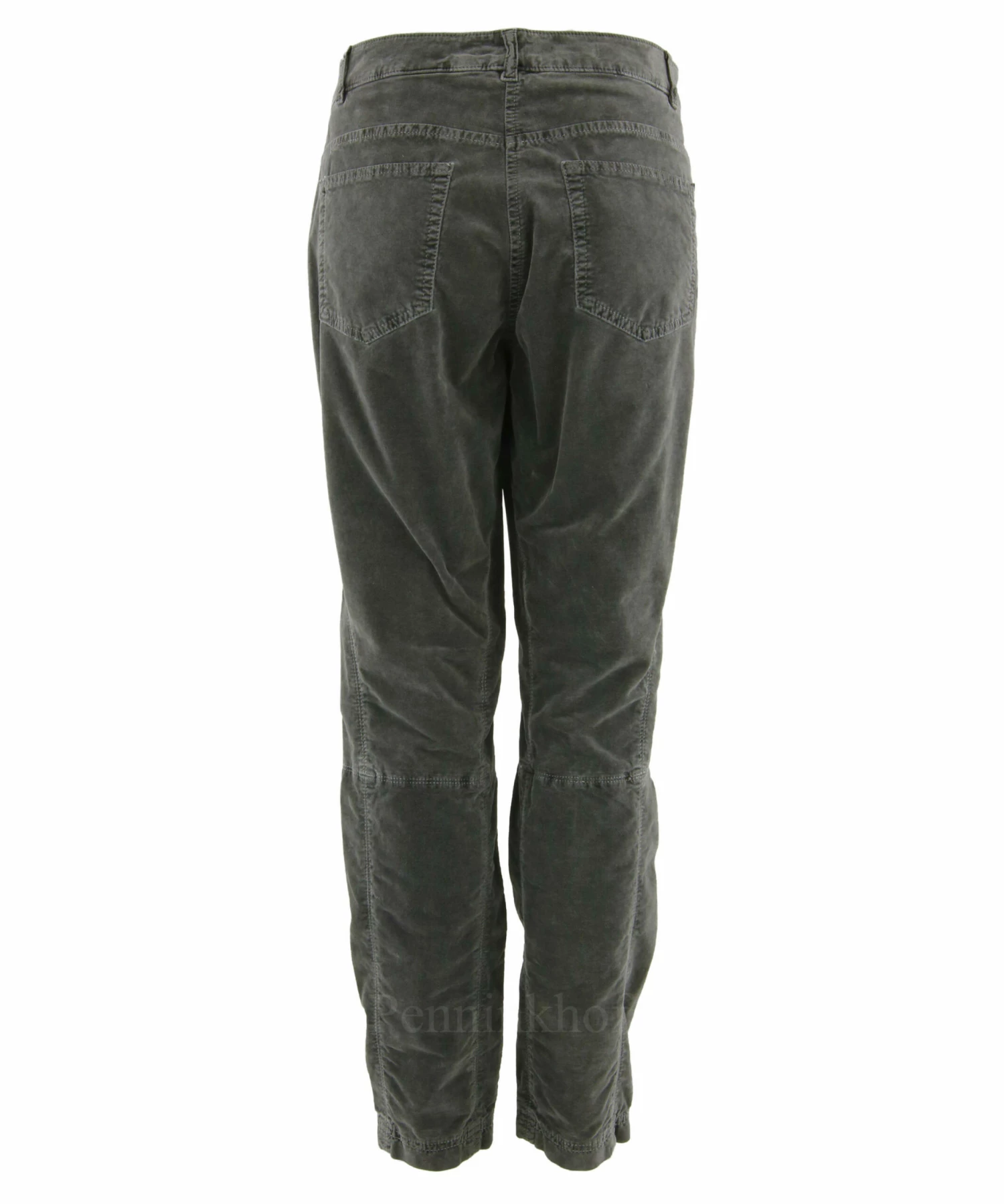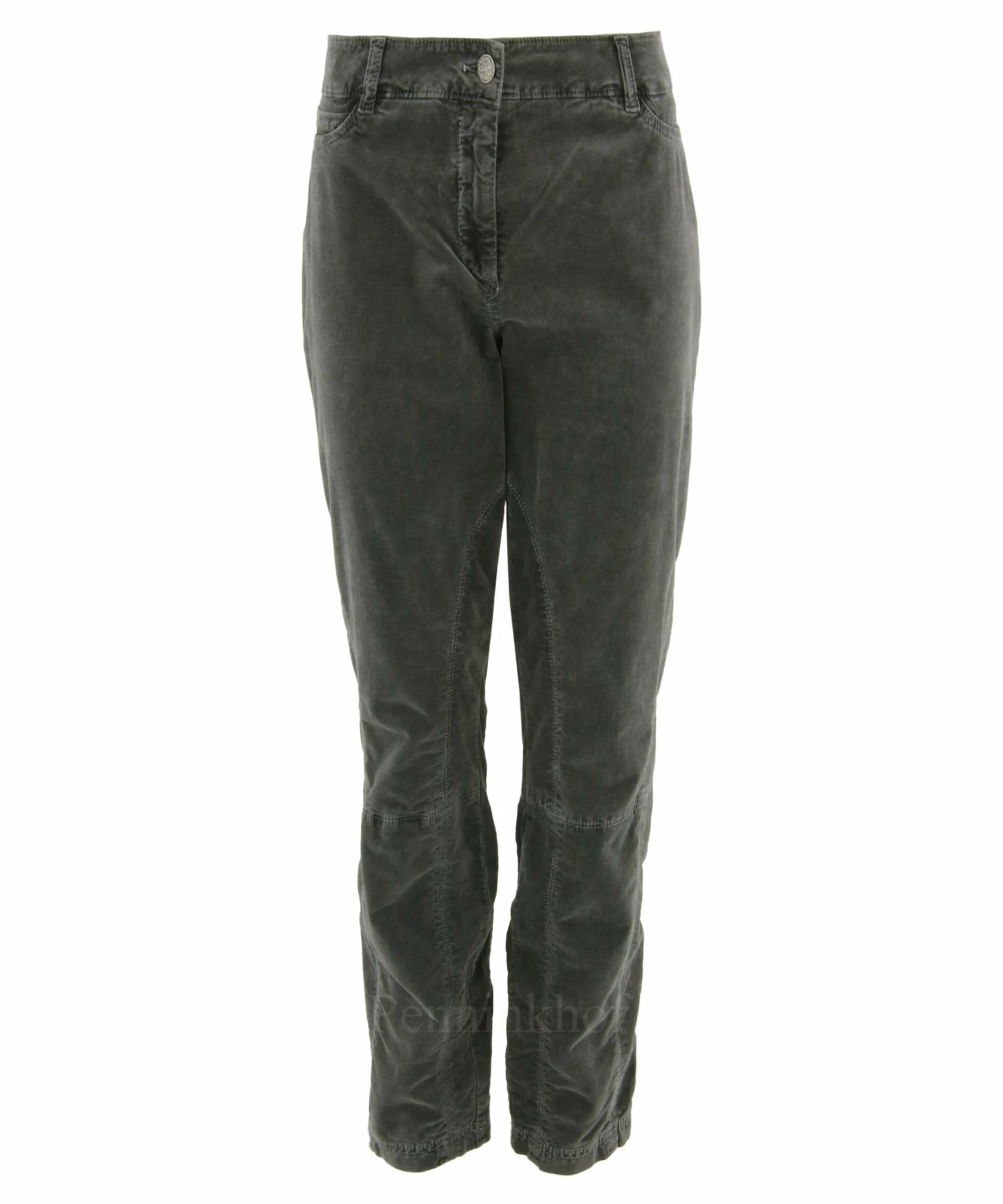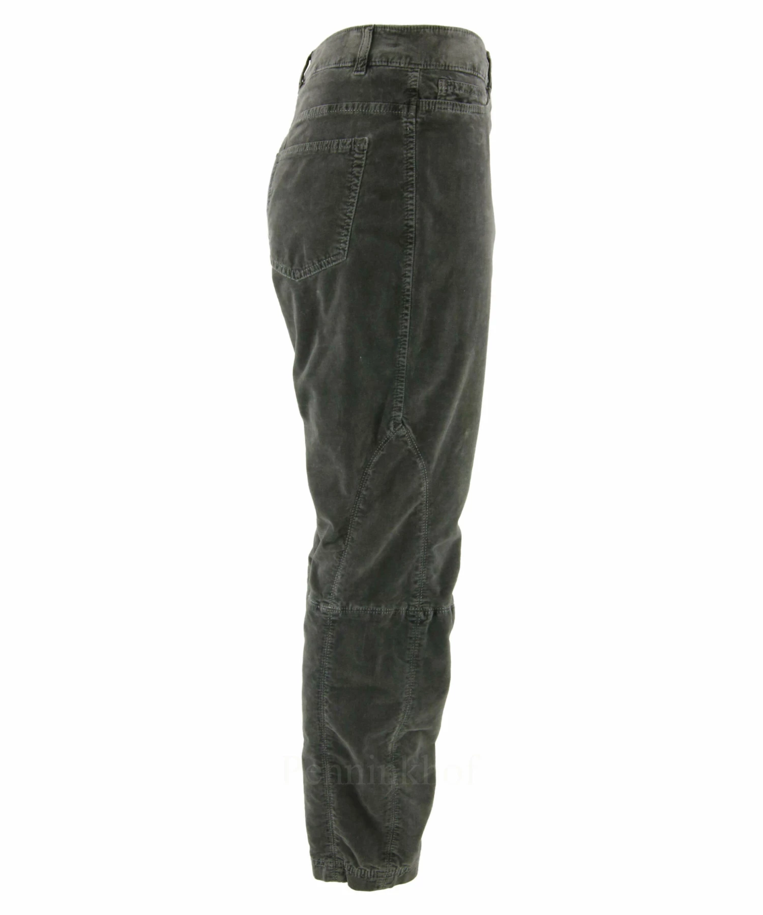 Een velour broek van Cambio in een domkere grijze kleur. De broek is in een 5 pocket model. Onder de knie is een horizontale stiknaad. deze broek mag op 30 graden worden gewassen.