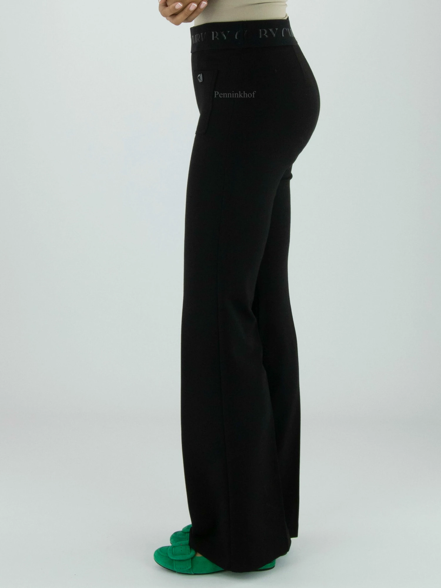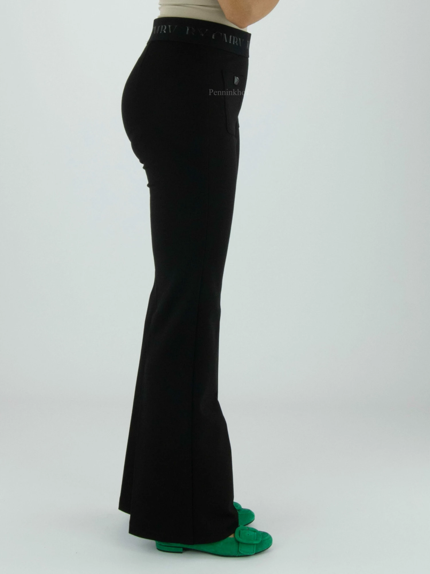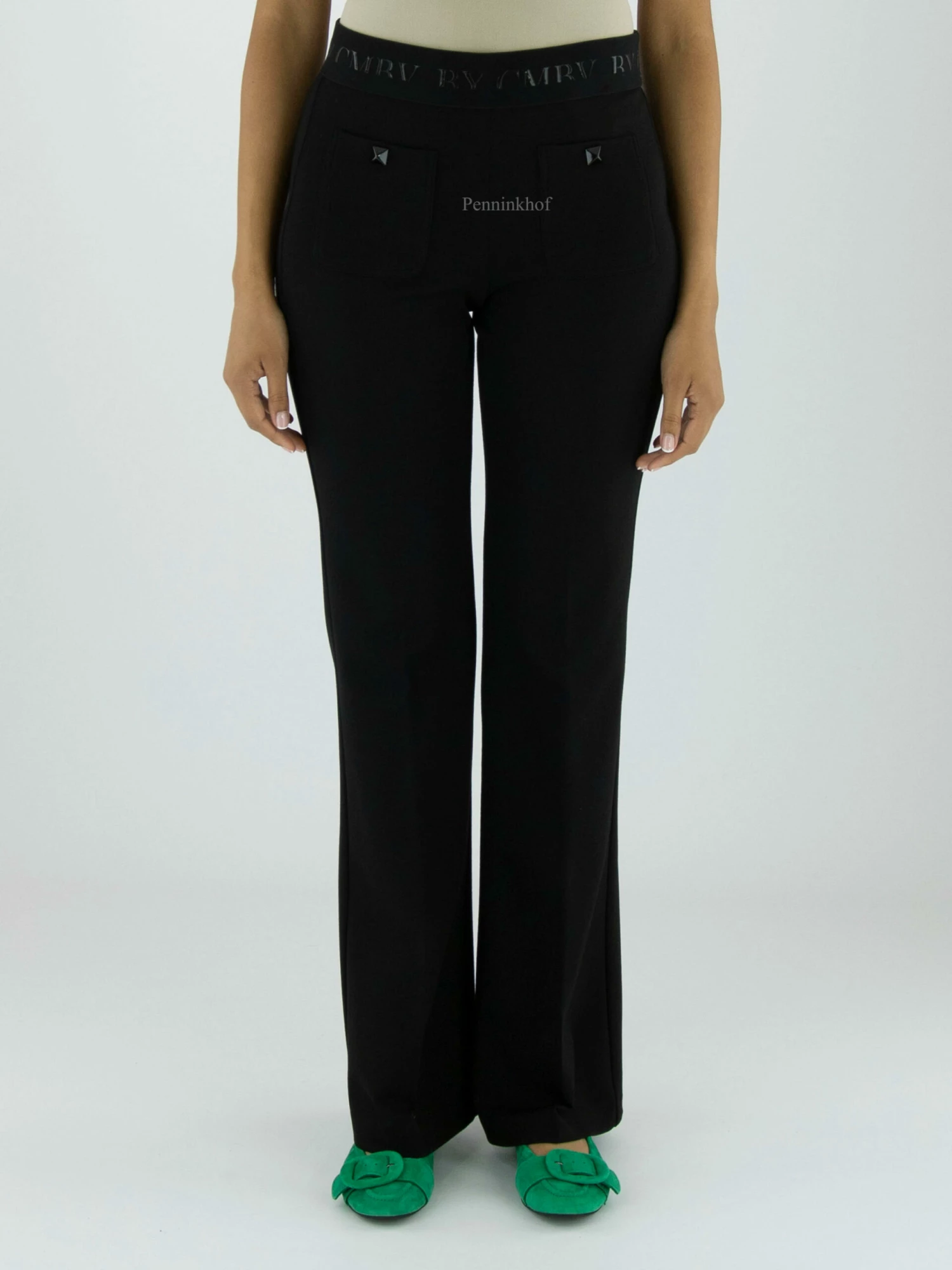 Een broek van Cambio in de kleur zwart. In de taille is een elastieken band. Aan de voorkant zijn onder de tailleband 2 zakken met en decoratieve stud in het midden. Deze broek mag op de hand worden gewassen.