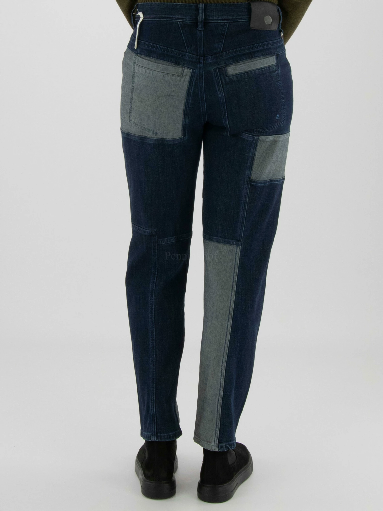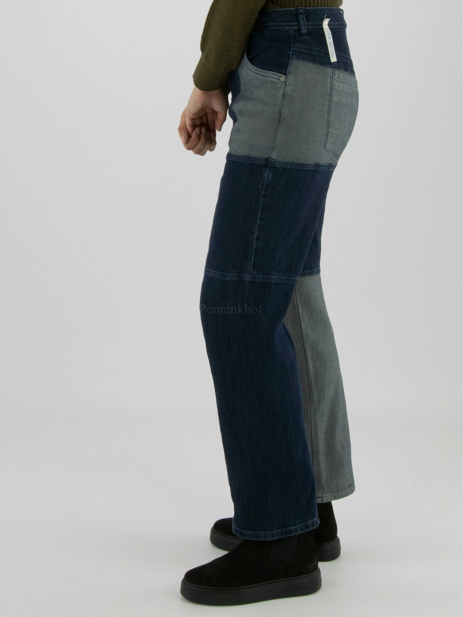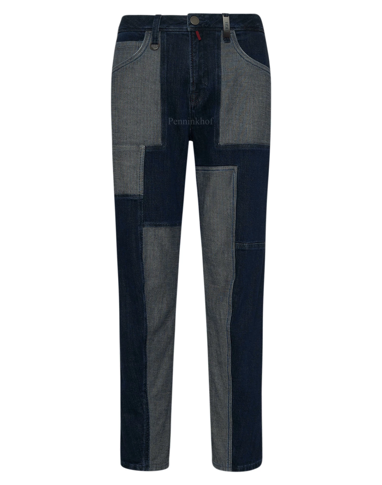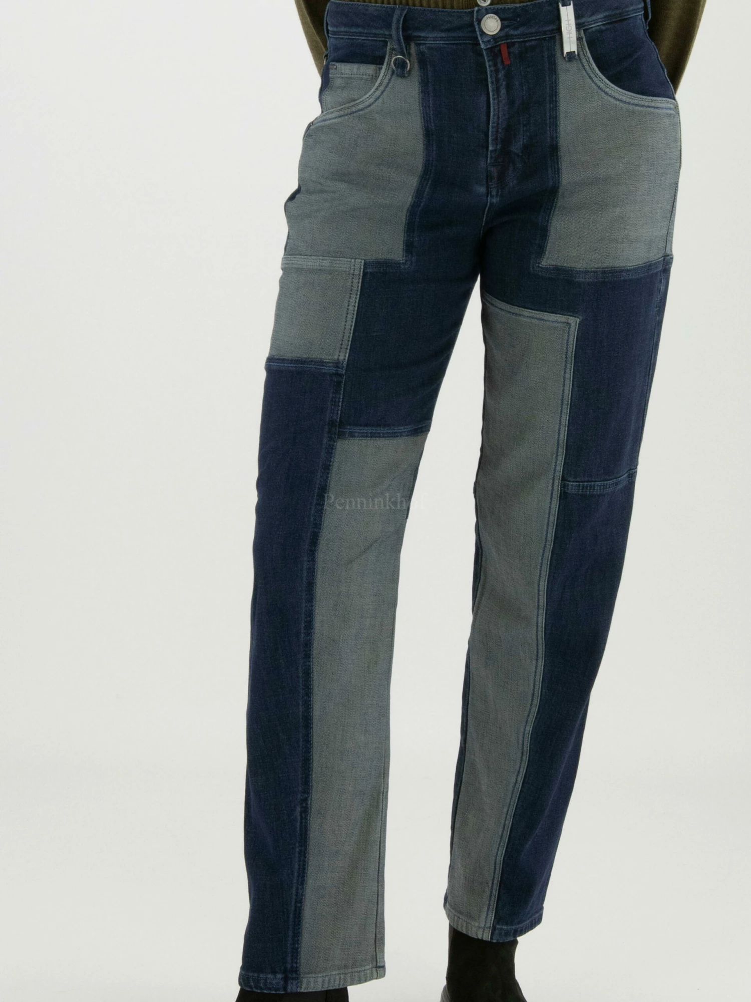 Een jeans van High in 3 verschillende jeans stoffen waarvan een normale jeans, een dark jeans en een gemêleerde jeans met lichtgrijs en jeansblauw. De jeans is in een 5 pocket model en mag op 30 graden worden gewassen.