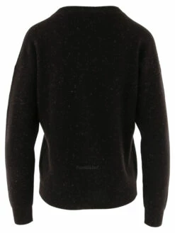 Een wijde pullover van High in de kleur zwart. De pullover heeft een ronde hals Aan de voor an achterkant zijn meerdere decoratieve ajour stiknaden in meerdere patronen. De zijkanten zijn gebreid in een open structuur. Deze pullover mag op de hand worden gewassen.