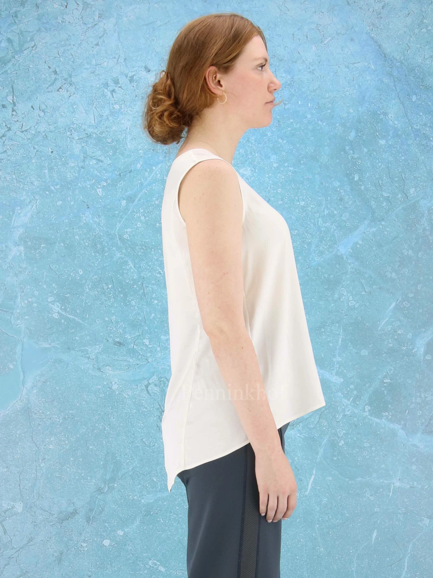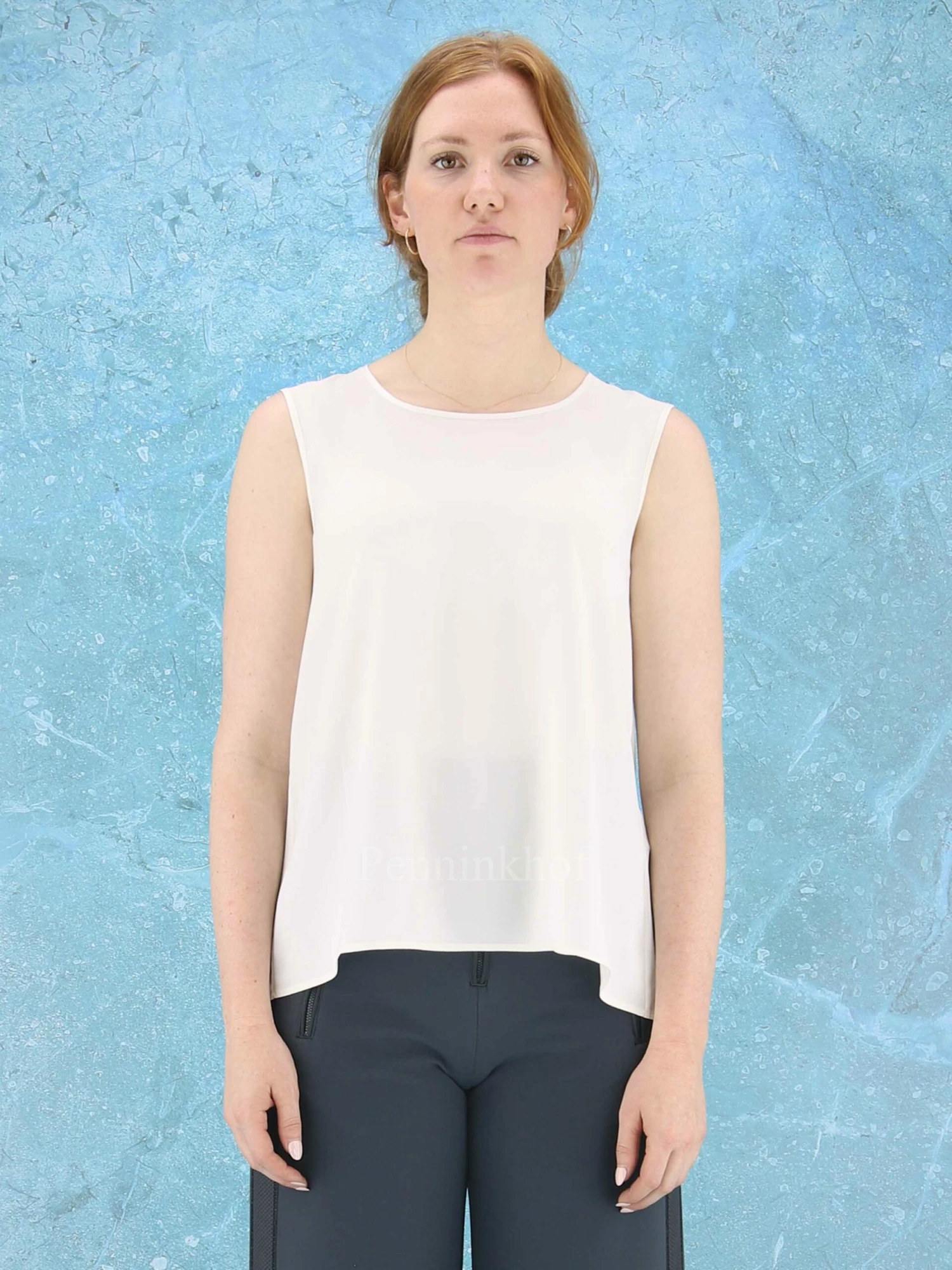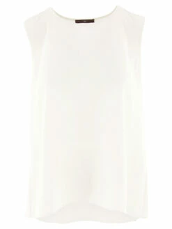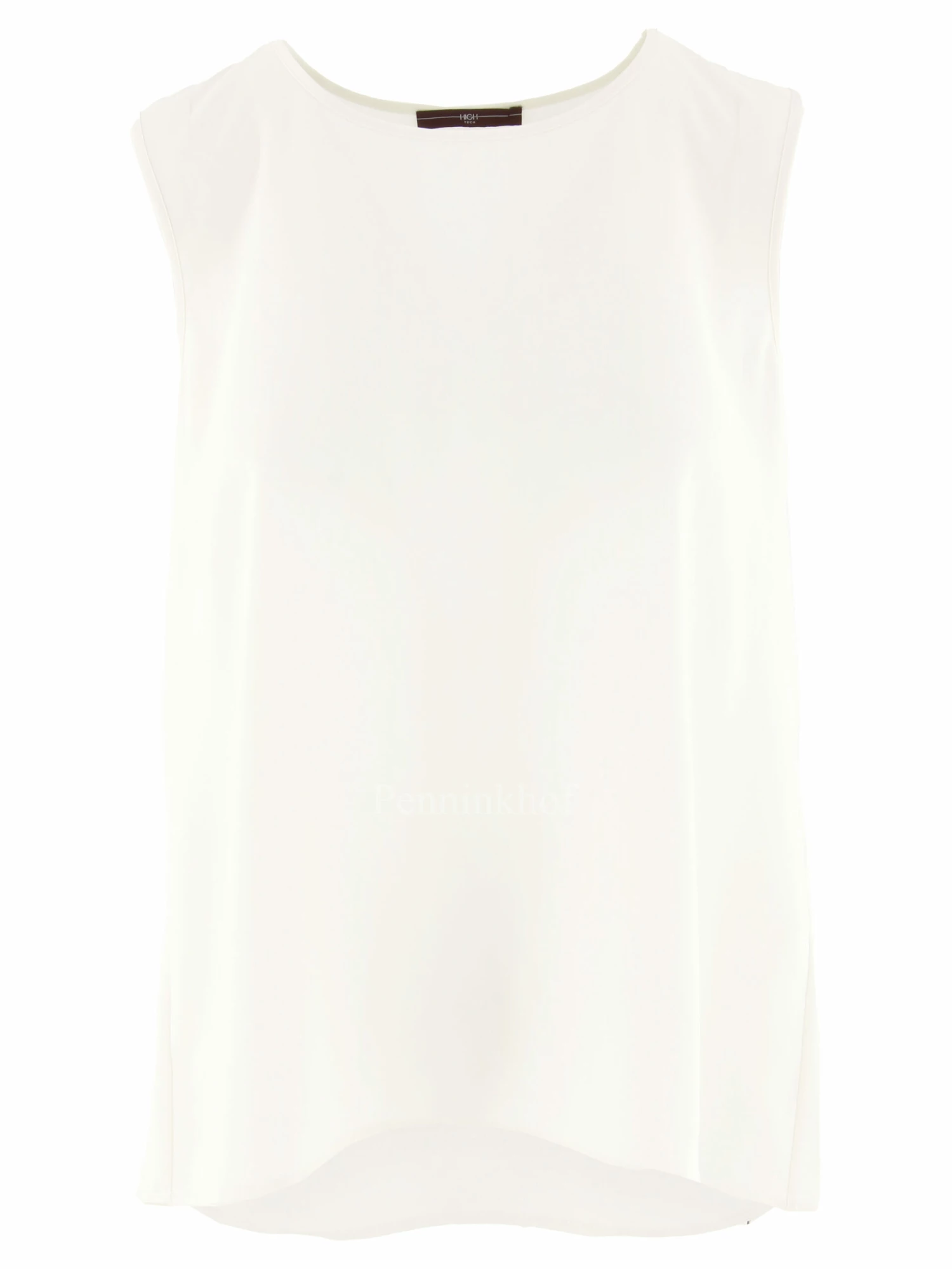 Een top van High in de kleur roomwit. De top heeft een ronde hals en heeft een lichte A – Lijn. Deze top mag op de hand worden gewassen.