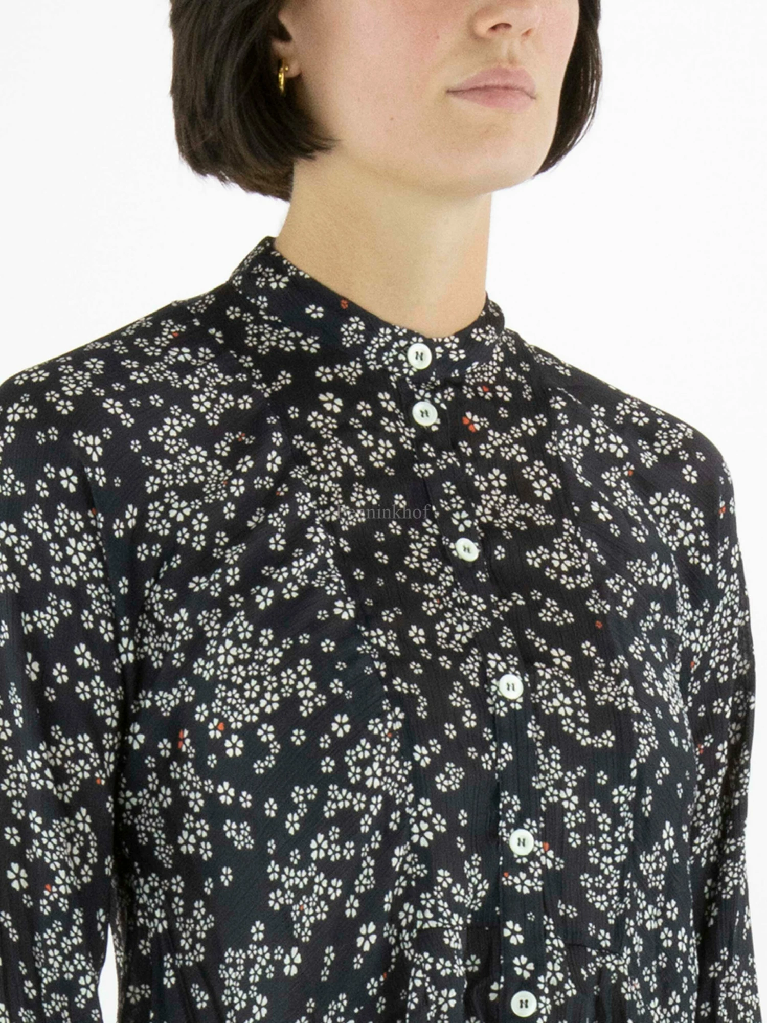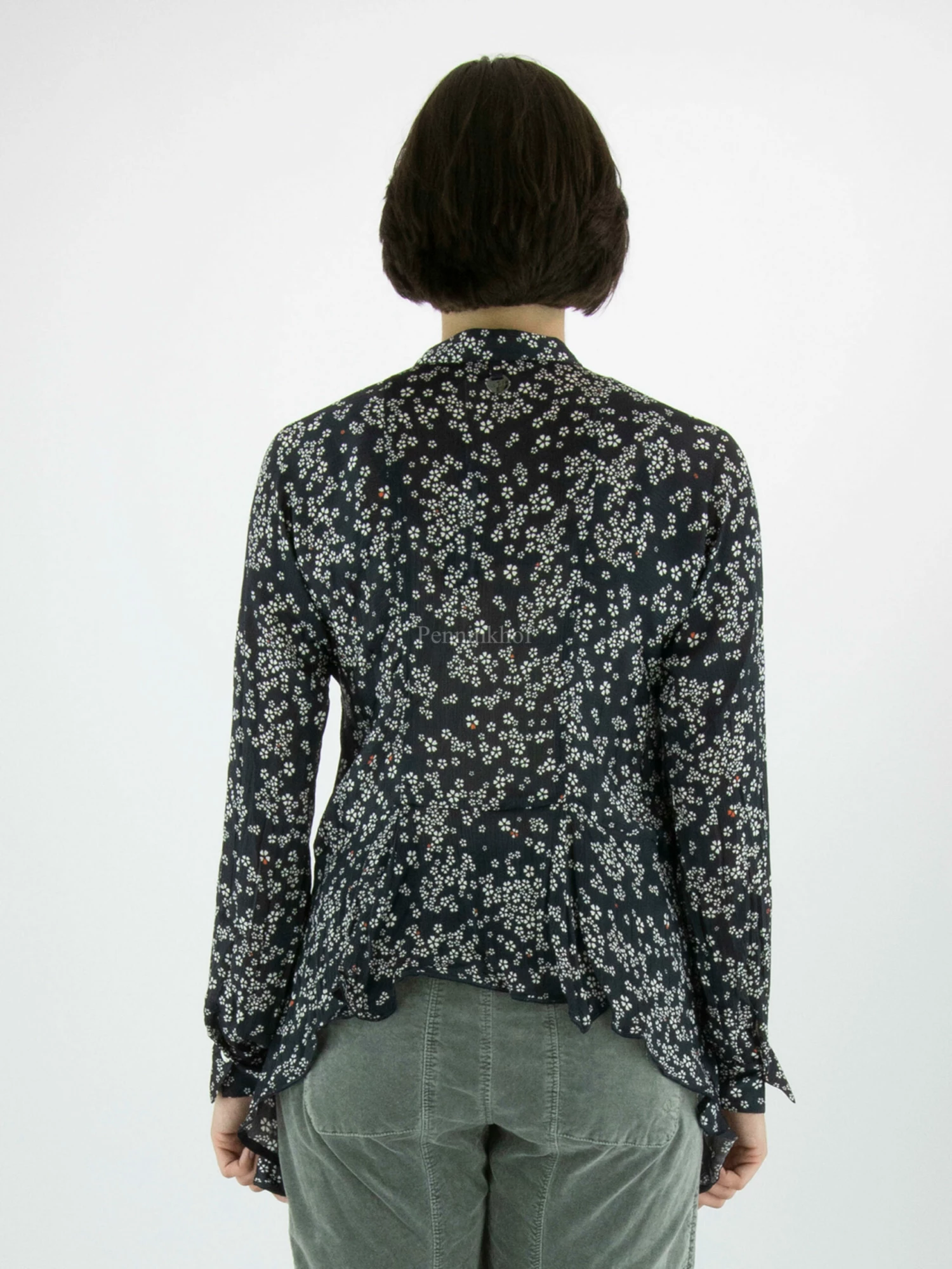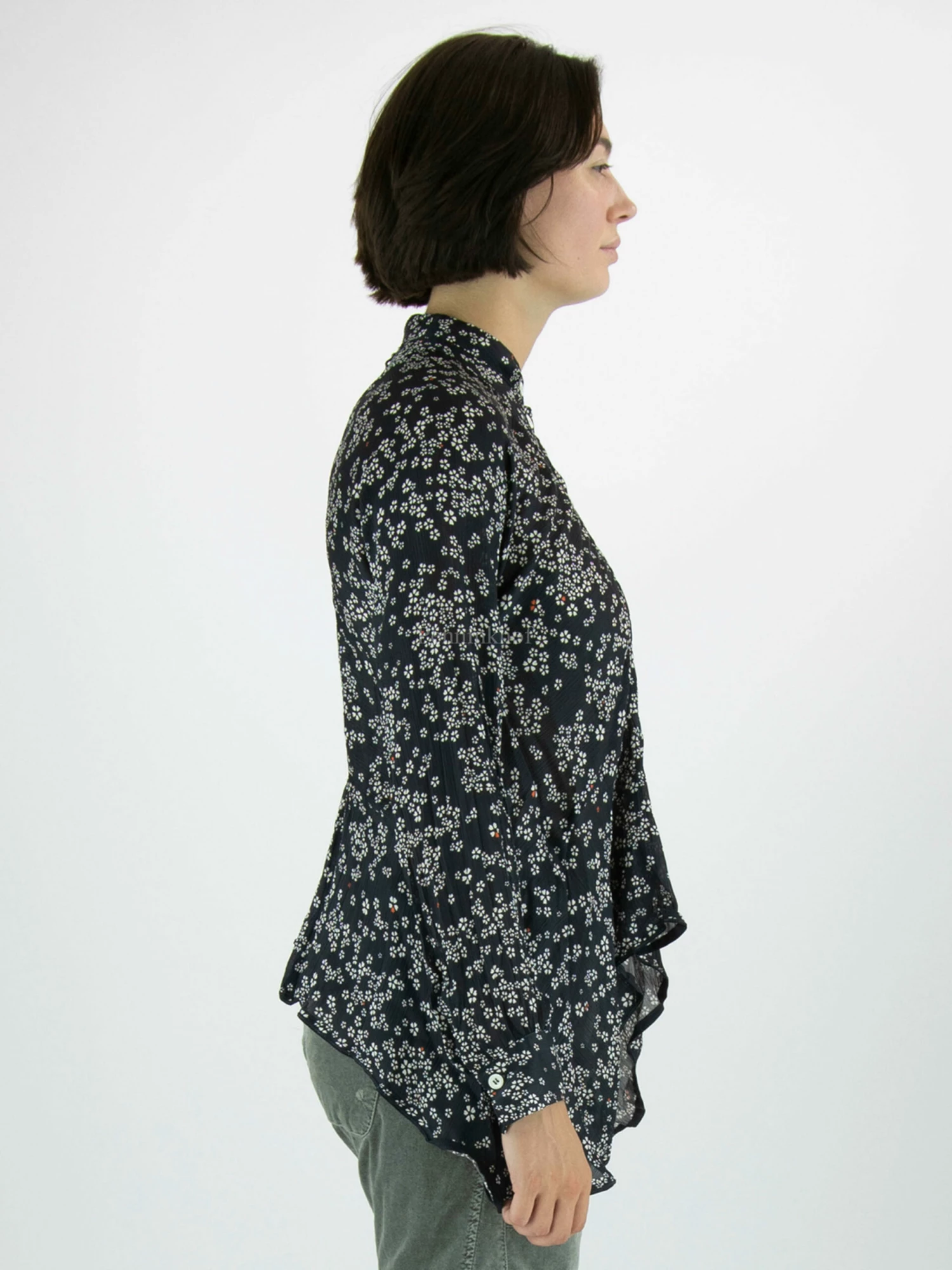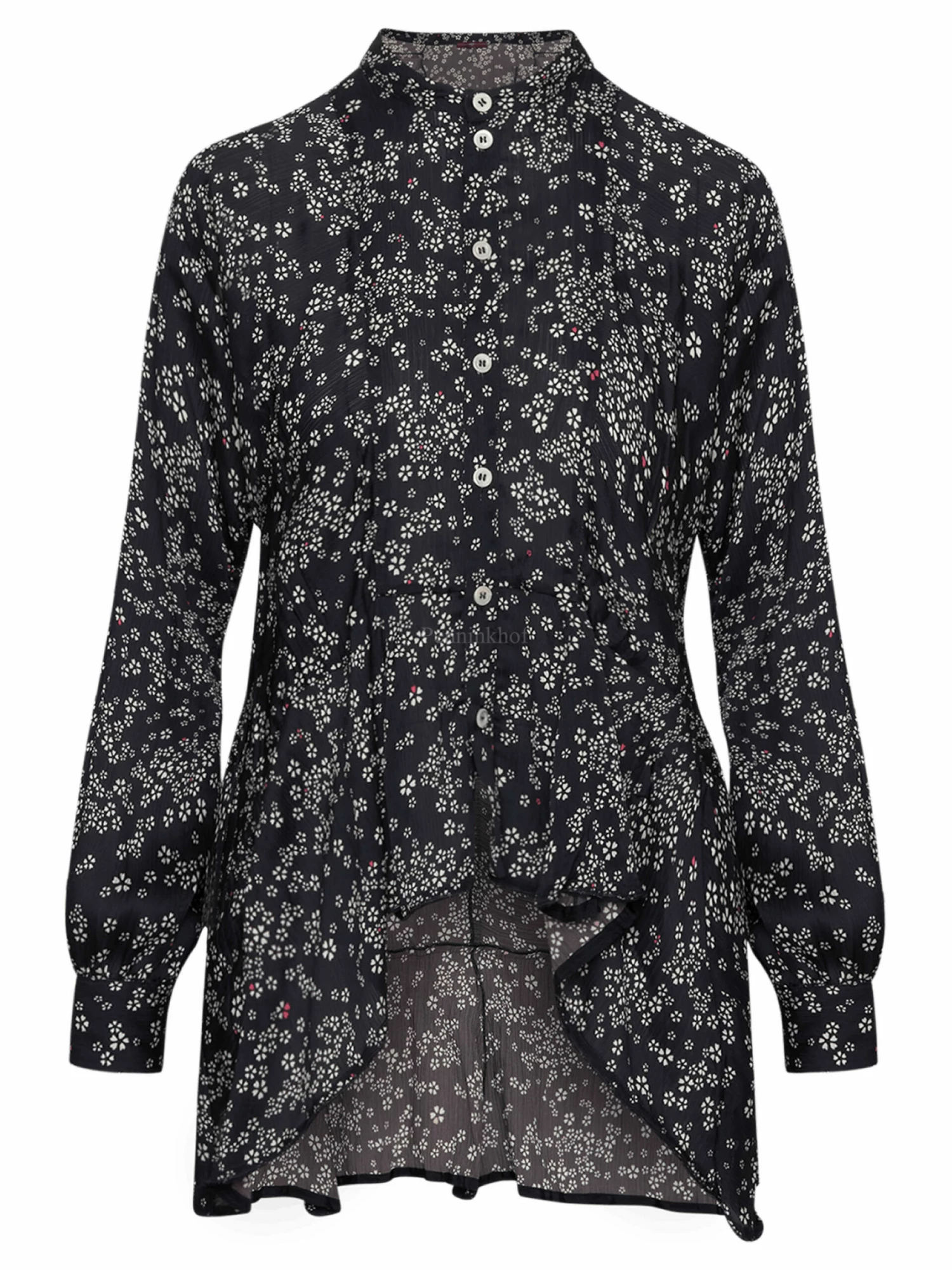 Een blouse van High in een bloemetjesprint met de kleuren roomwit op een marineblauwe achtergrond. Ter hoogte van de taille is een stiknaad. Vanaf de stiknaad heeft de blouse aan beide zijkanten langere stof. Deze blouse mag op 30 graden worden gewassen.