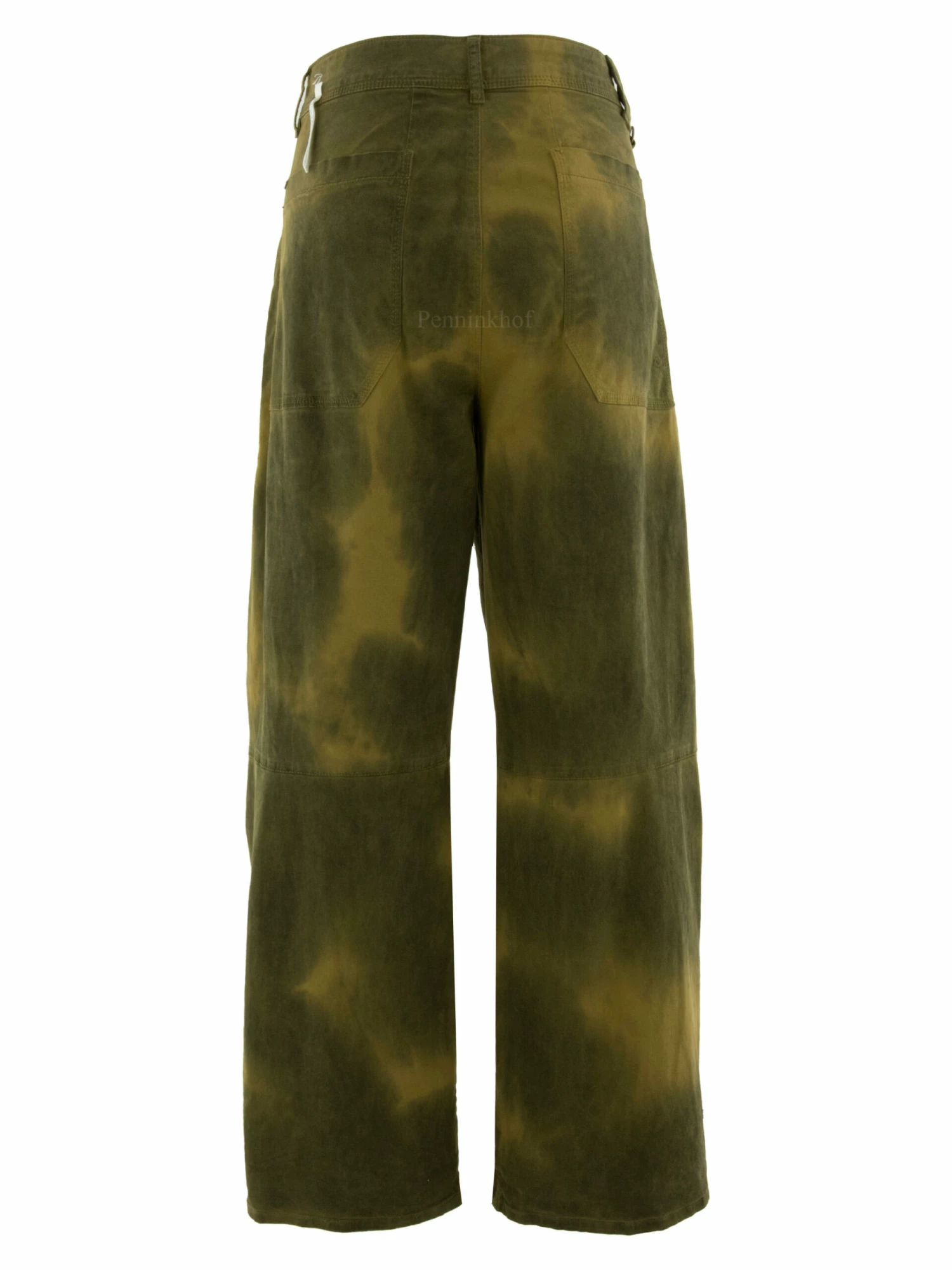 Een jeans van High in een camouflage print met meerdere tinten groen. De jeans heeft een sluiting met knopen. De steekzakken zijn diagonaal gesneden. Deze jeans mag op 30 graden worden gewassen.