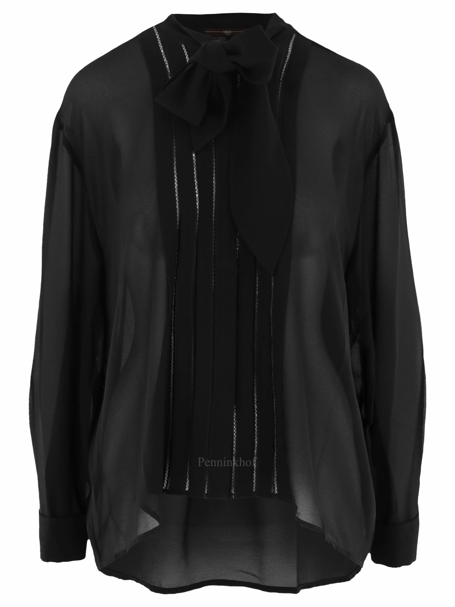 Een blouse van High in de kleur zwart. Vanuit de hals zijn 2 decoratieve shawl linten. Aan beide zijden van de sluiting zijn 3 plissé plooien met daartussen ajour biezen. Aan de uiteinden van de mouwen is een omslag. Deze blouse mag op de hand worden gewassen.
