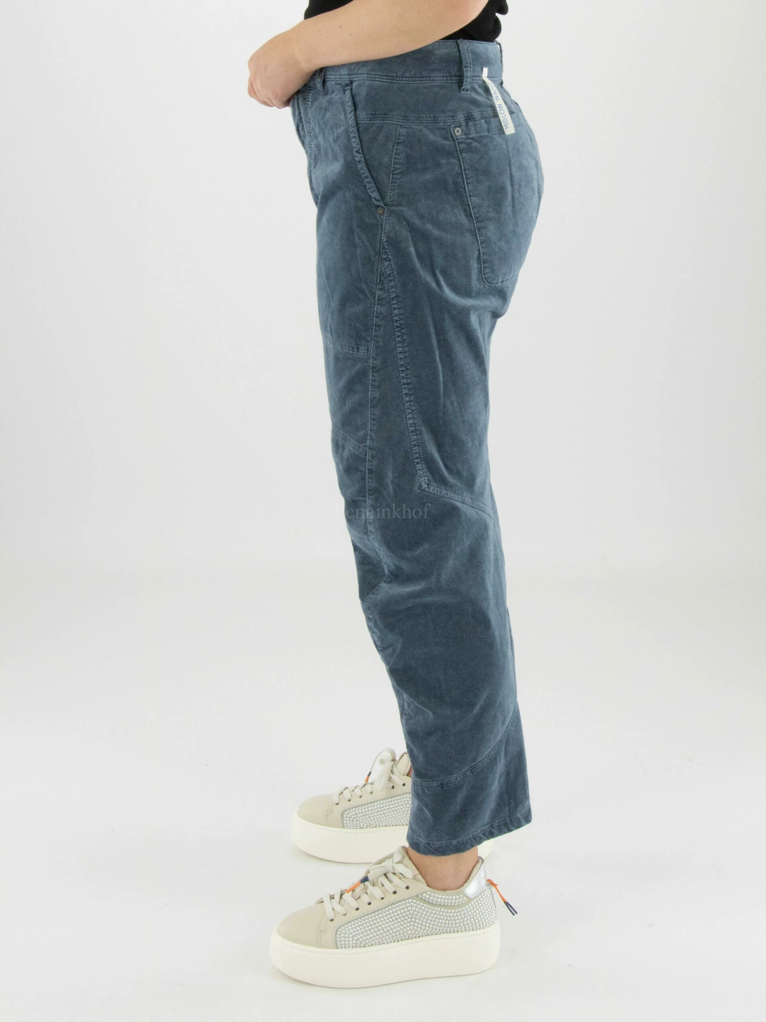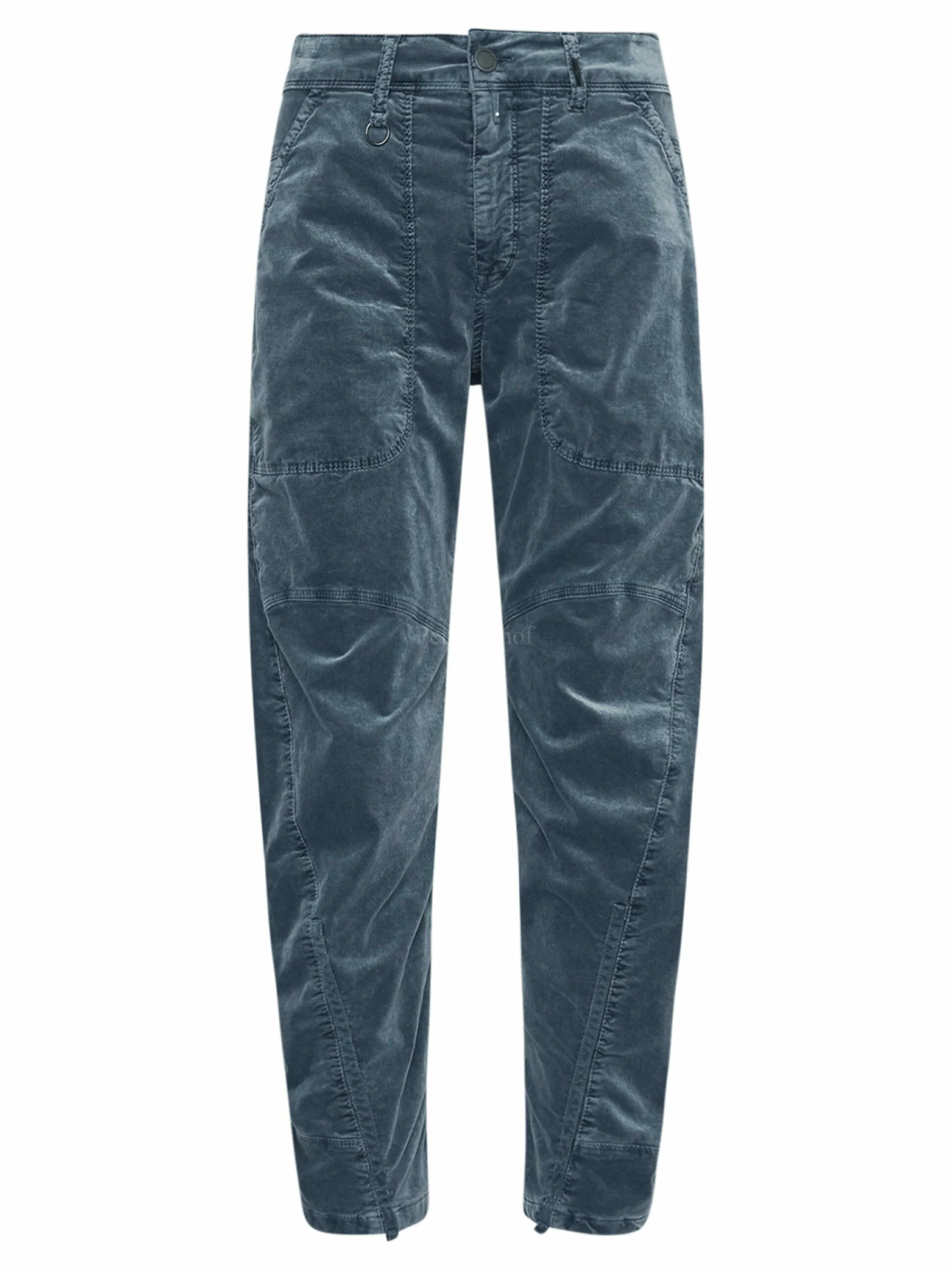 Een velour broek van High in een zachte blauwe kleur. De broek heeft meerdere decoratieve stiknaden en steekzakken. Aan de onderkant is ter hoogte van de kuit een verticale fluwelen bies. Deze broek mag op 30 graden worden gewassen.