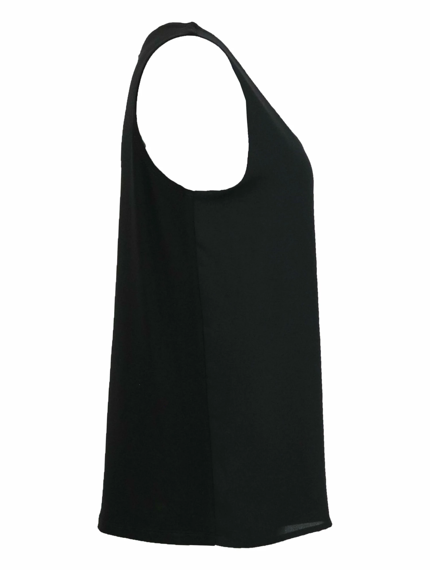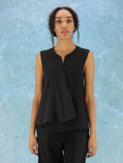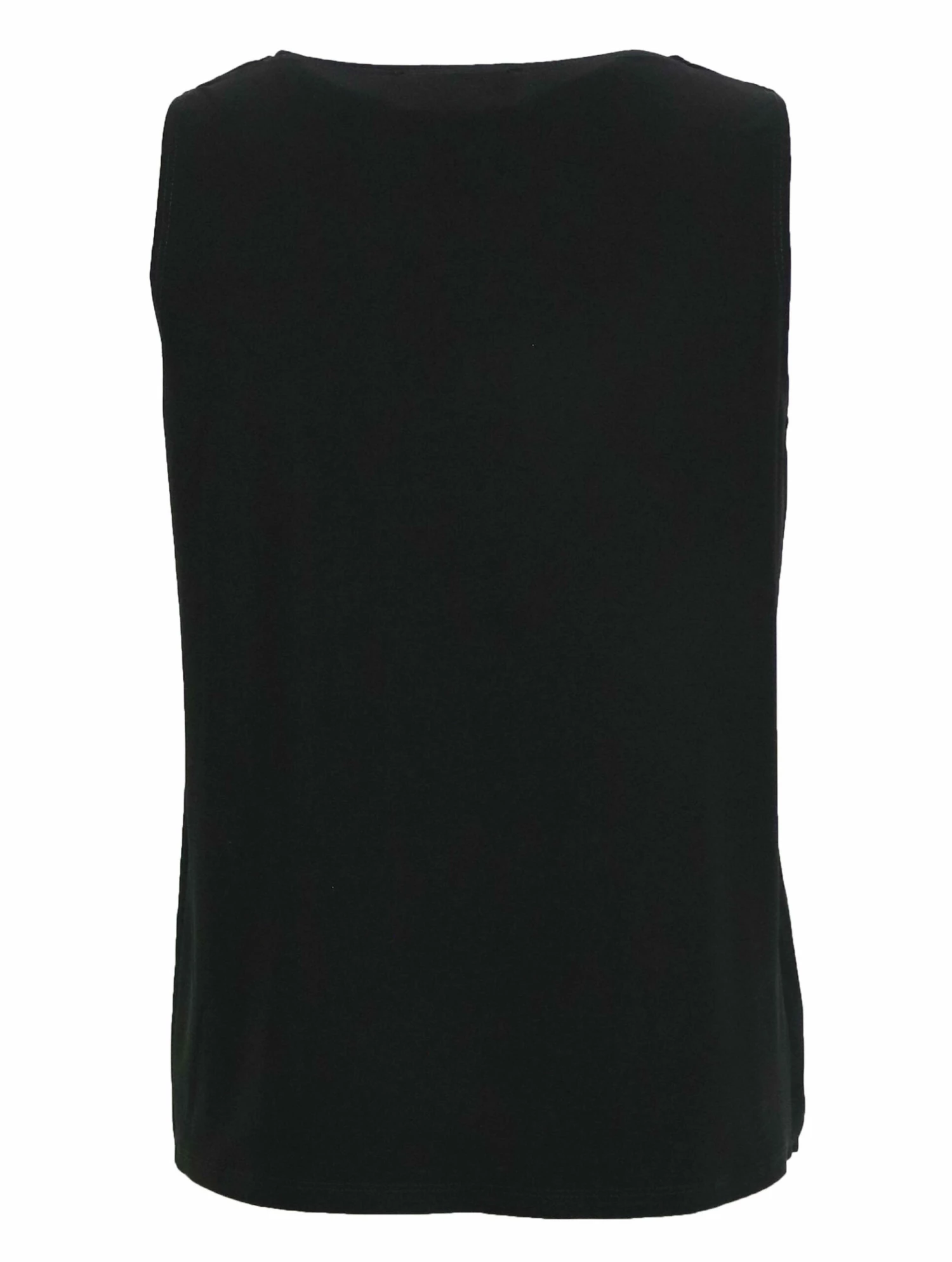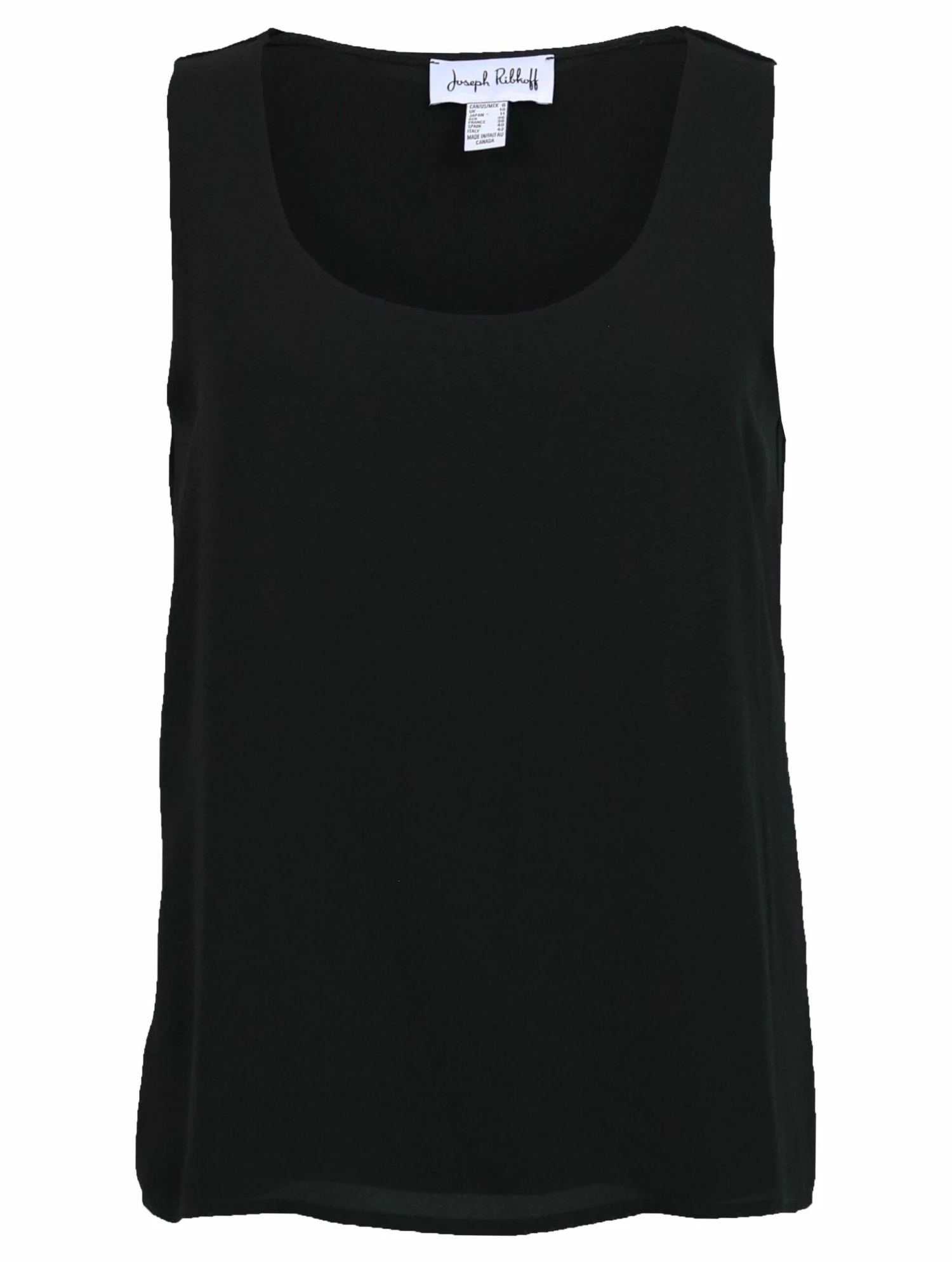 Een top van Joseph Ribkoff in de kleur zwart. De top heeft een diepe ronde hals en de voorkant heeft een dubbele stof. Deze top mag op de hand worden gewassen.