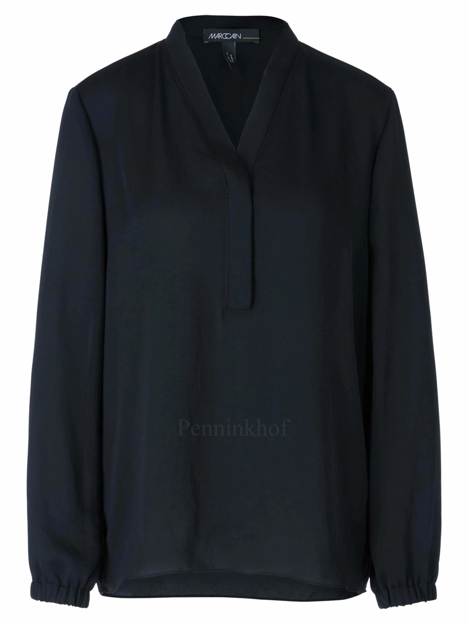 Een blouse van Marc Cain in de kleur marineblauw. Langs de rand van de V – Hals is een bies in een dubbele stof. met een decoratieve doorgestikte naad. Aan het uiteinde van de lange mouwen is een elastische fijn geplooide bies. deze blouse mag op 30 graden worden gewassen.