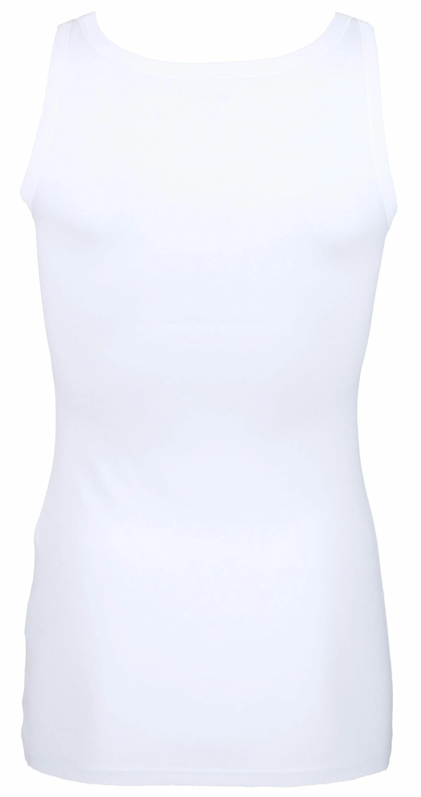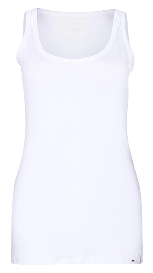 Een top van het merk Marc Cain uit de essentiels collectie in de kleur wit. De top heeft een ronde hals en een schouderband van 3 cm breed. Deze top mag op 30 graden worden gewassen.