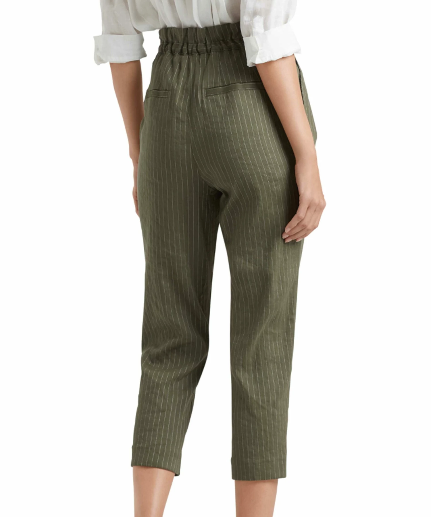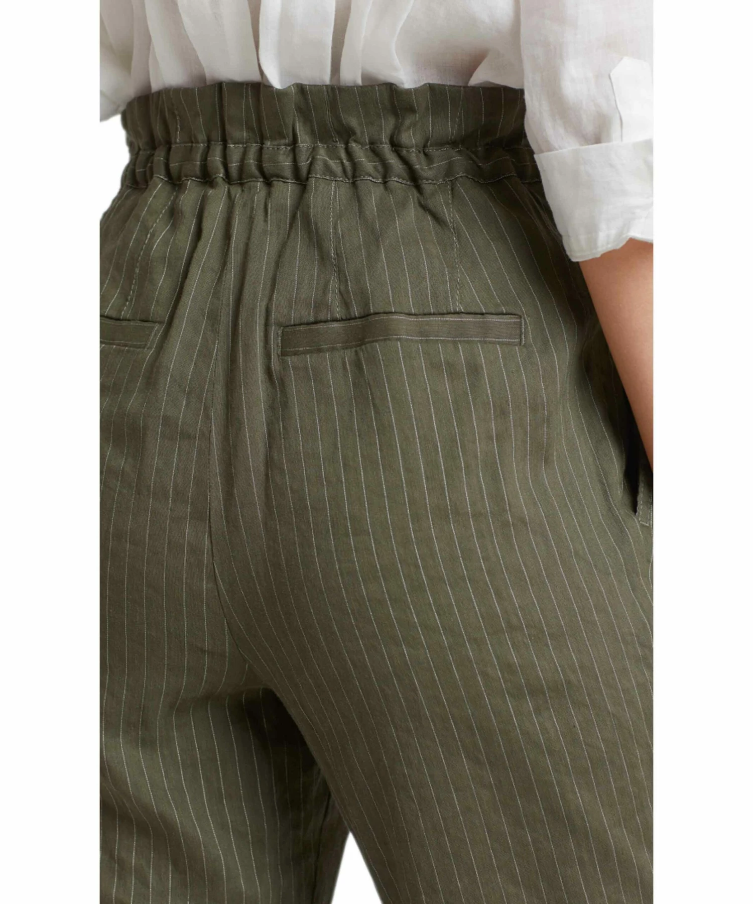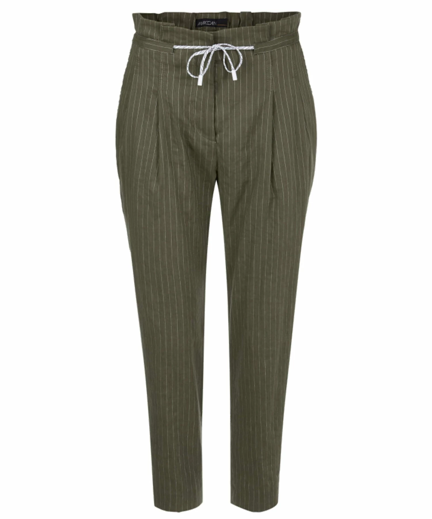 Een broek van Marc Cain in een krijtstreep met de kleuren olijfgroen en wit. In de tailleband zijn meerdere plooien en is een koordverwerking. De broek heeft steekzakken en mag op 30 graden worden gewassen.