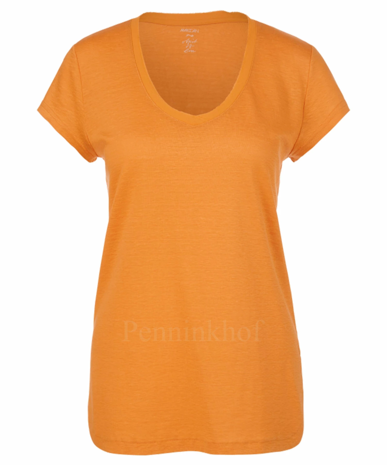 Een shirt van Marc Cain in de kleur geel. Langs de rand van de V – Hals is een bies van een dubbele transparante stof. Aan de onderkant is het shirt rond gesneden. Dit shirt mag op 30 graden worden gewassen.