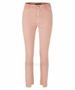 Een jeans van Marc Cain in een vale zalmkleur. De jeans is in een 5 pocket model. De binnenzijde van de pijpen hebben een iets vollere kleur. Aan de onderkant van de pijpen is aan de binnenzijde een inkeping. Deze jeans mag op 30 graden worden gewassen.