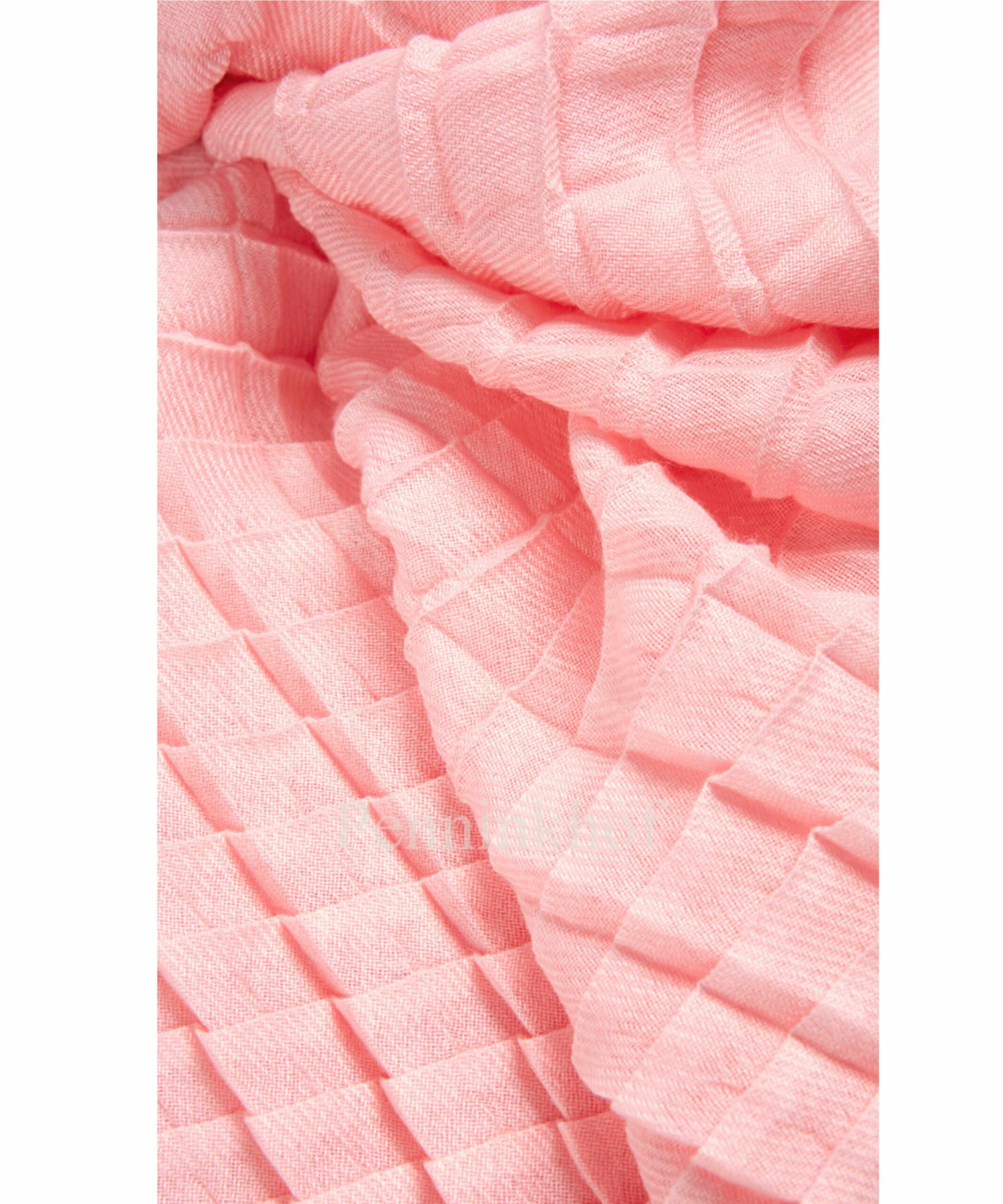 Een shawl van Marc Cain in een diagonaal geplisseerde structuur in de kleur roze. Langs de randen is de stof fijn gerafeld. deze shawl mag op de hand worden gewassen.