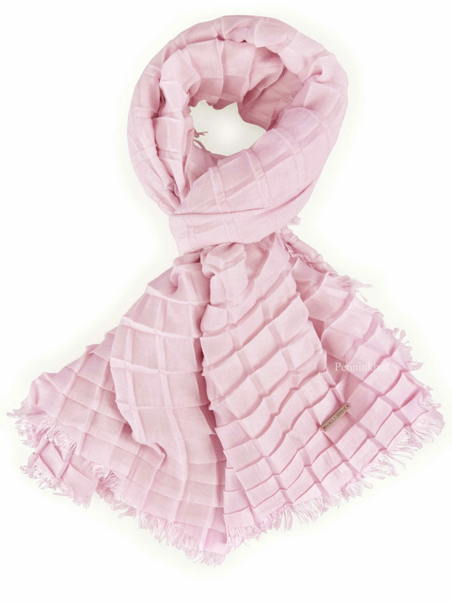 Een shawl van Marc Cain in de kleur pastel roze. De shawl is geweven in een wafel structuur. De randen zijn fijn gerafeld. Deze shawl mag op de hand worden gewassen.