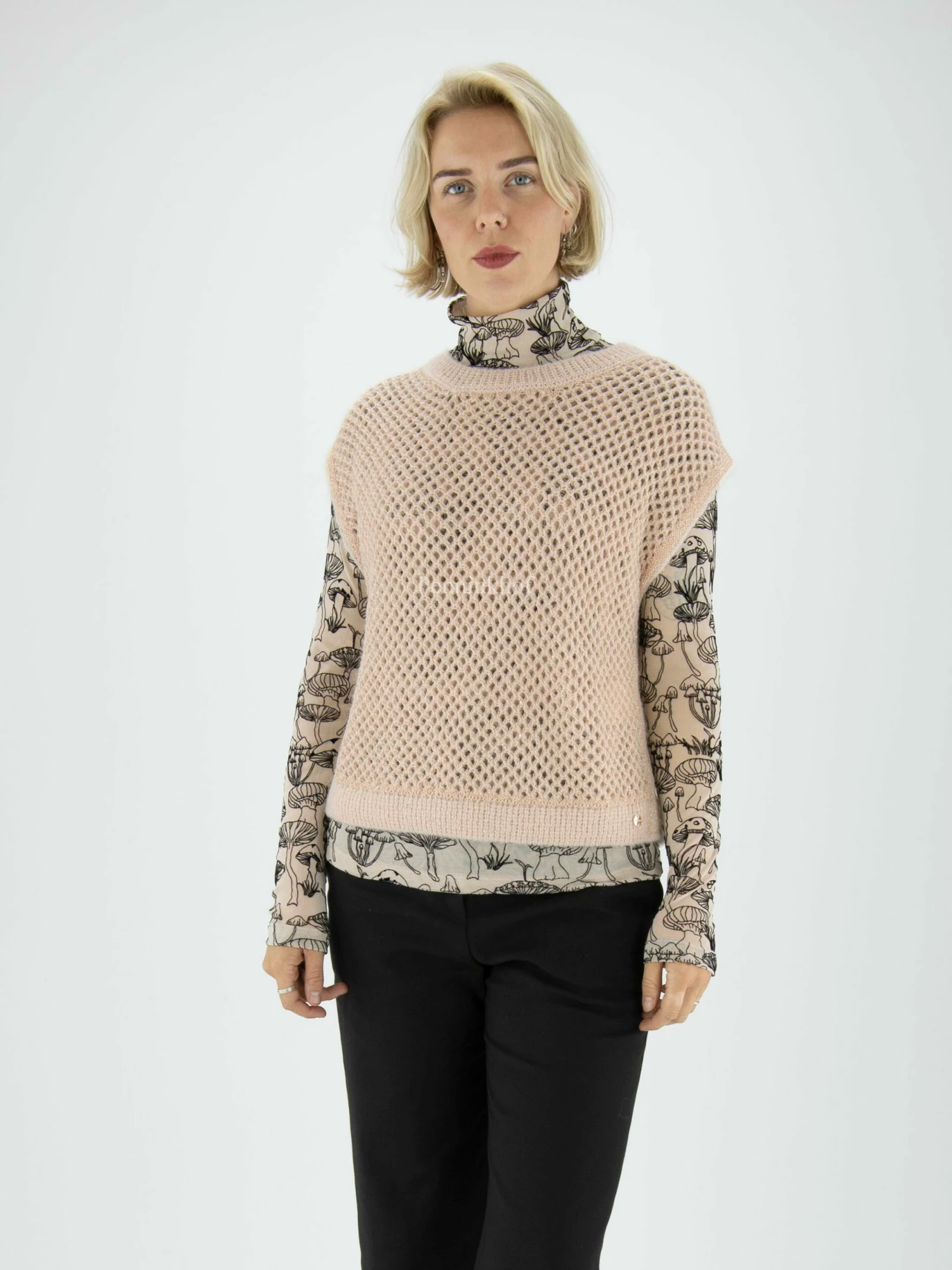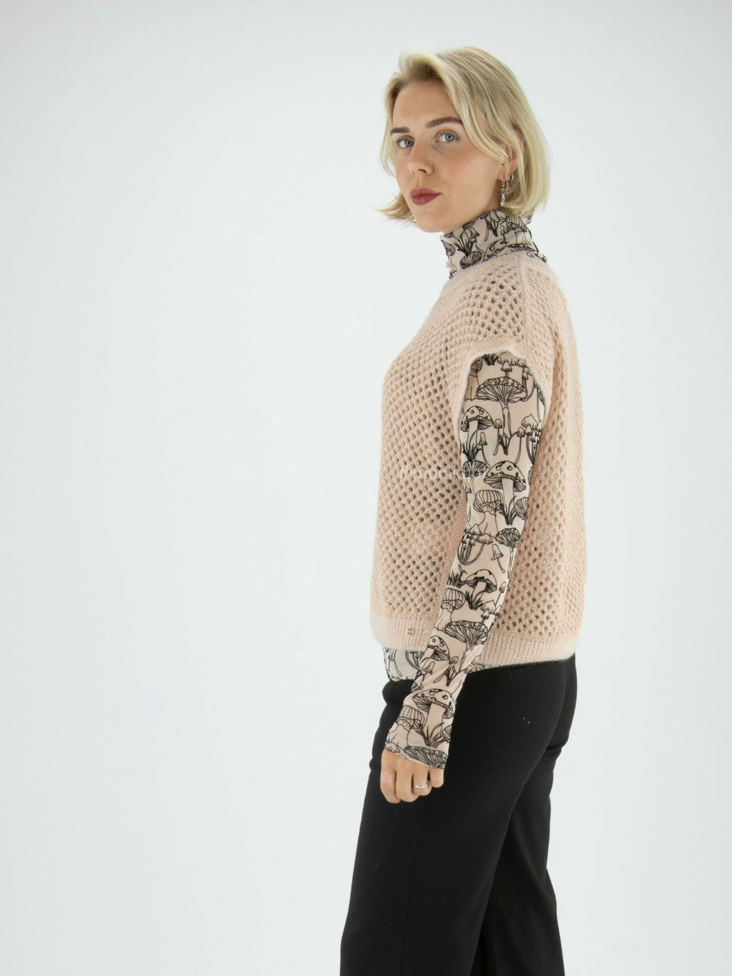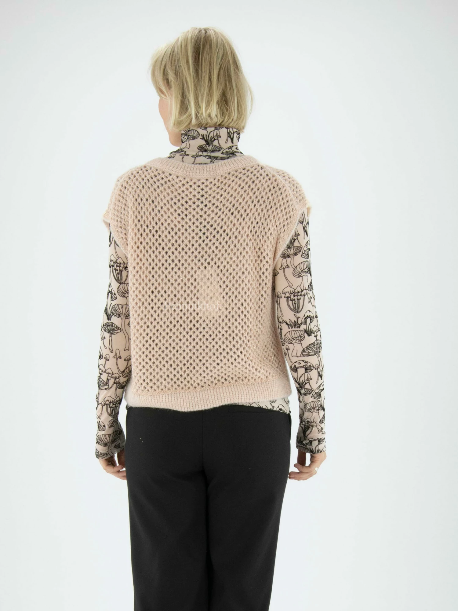 Een opengebreidde spencer van Marc Cain in de kleur beige. In de stof zijn parelmoer kleurige lovertjes geweven. Langs de rand van de hals is een fijn geribbelde tricot boord. Deze spencer mag op de hand worden gewassen.