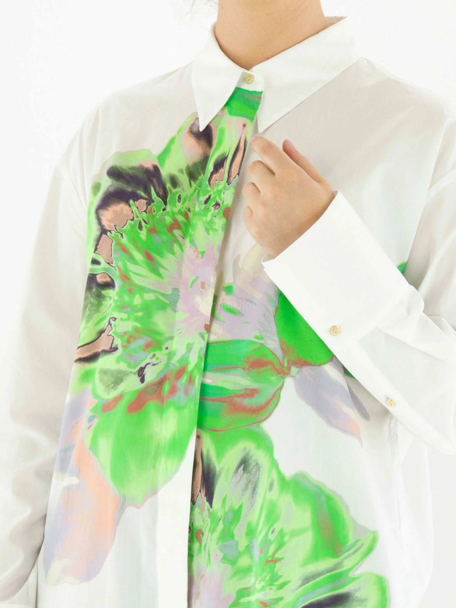Een blouse van Marc Cain met aan de voorkant een grafische bloemenprint met meerdere tinten groen, lila en bruin op een witte achtergrond. Aan het uiteinde van de lange mouwen zijn brede manchetten met goudkleurige knoopjes. Deze blouse mag op 30 graden worden gewassen.