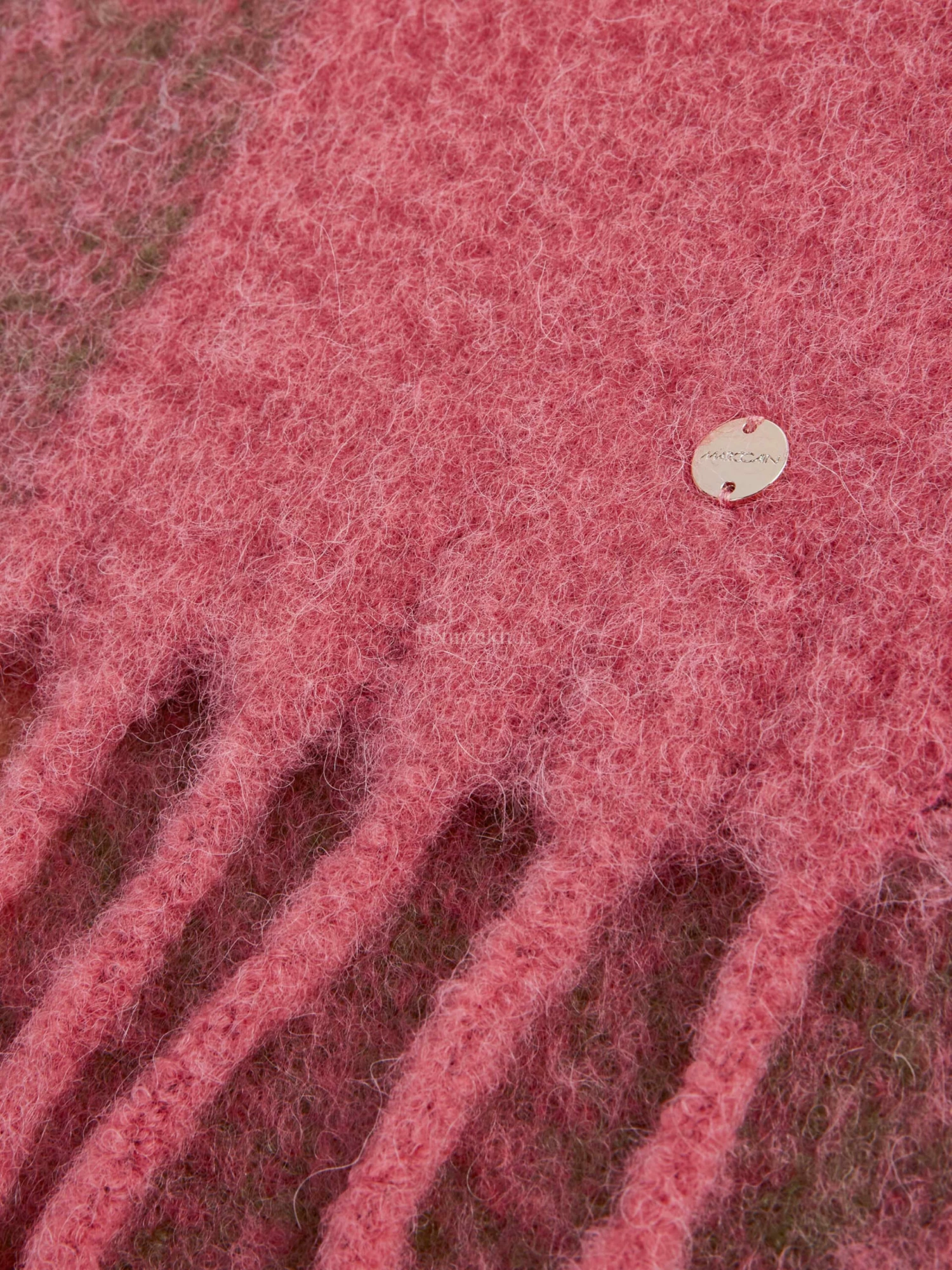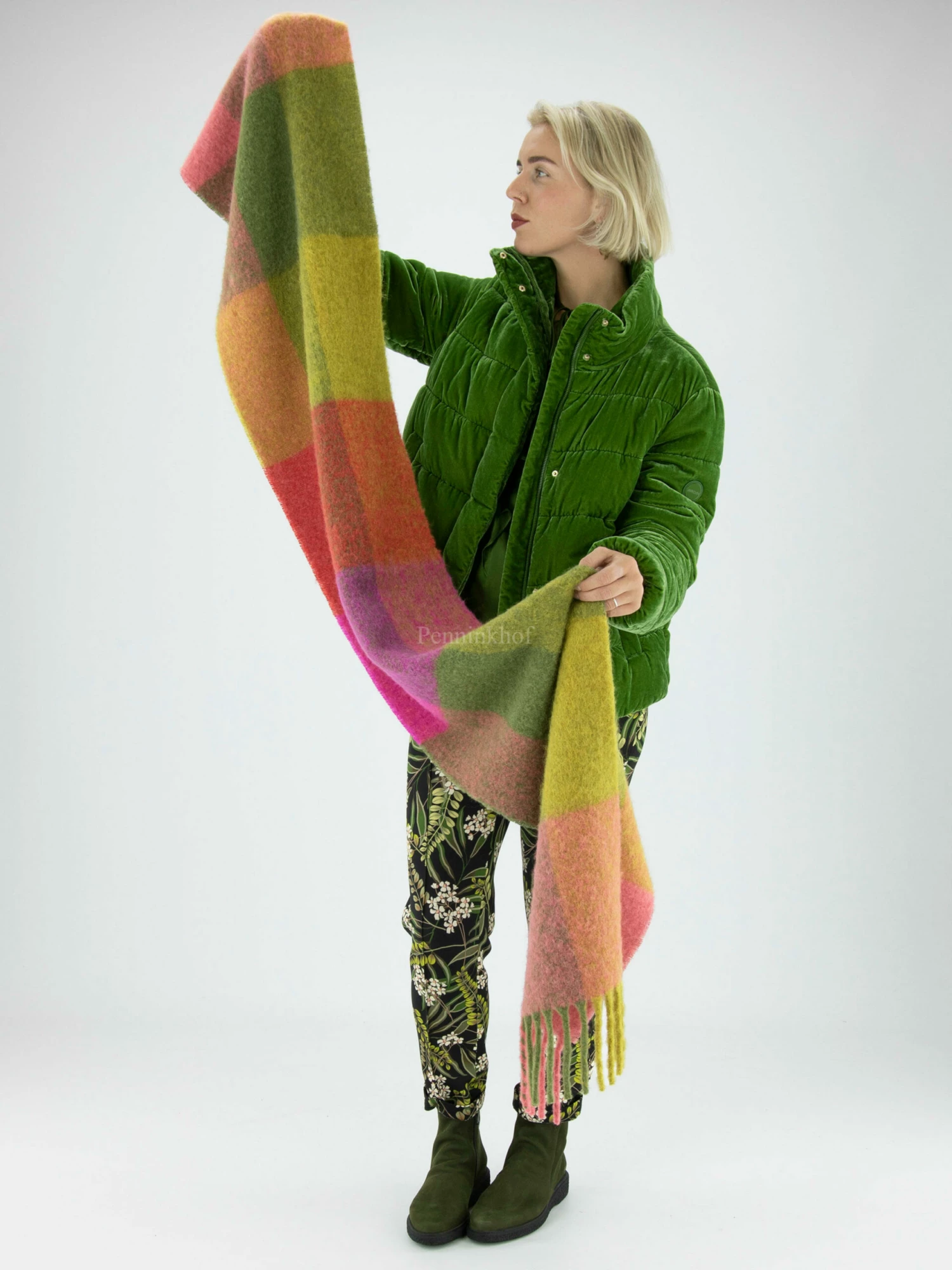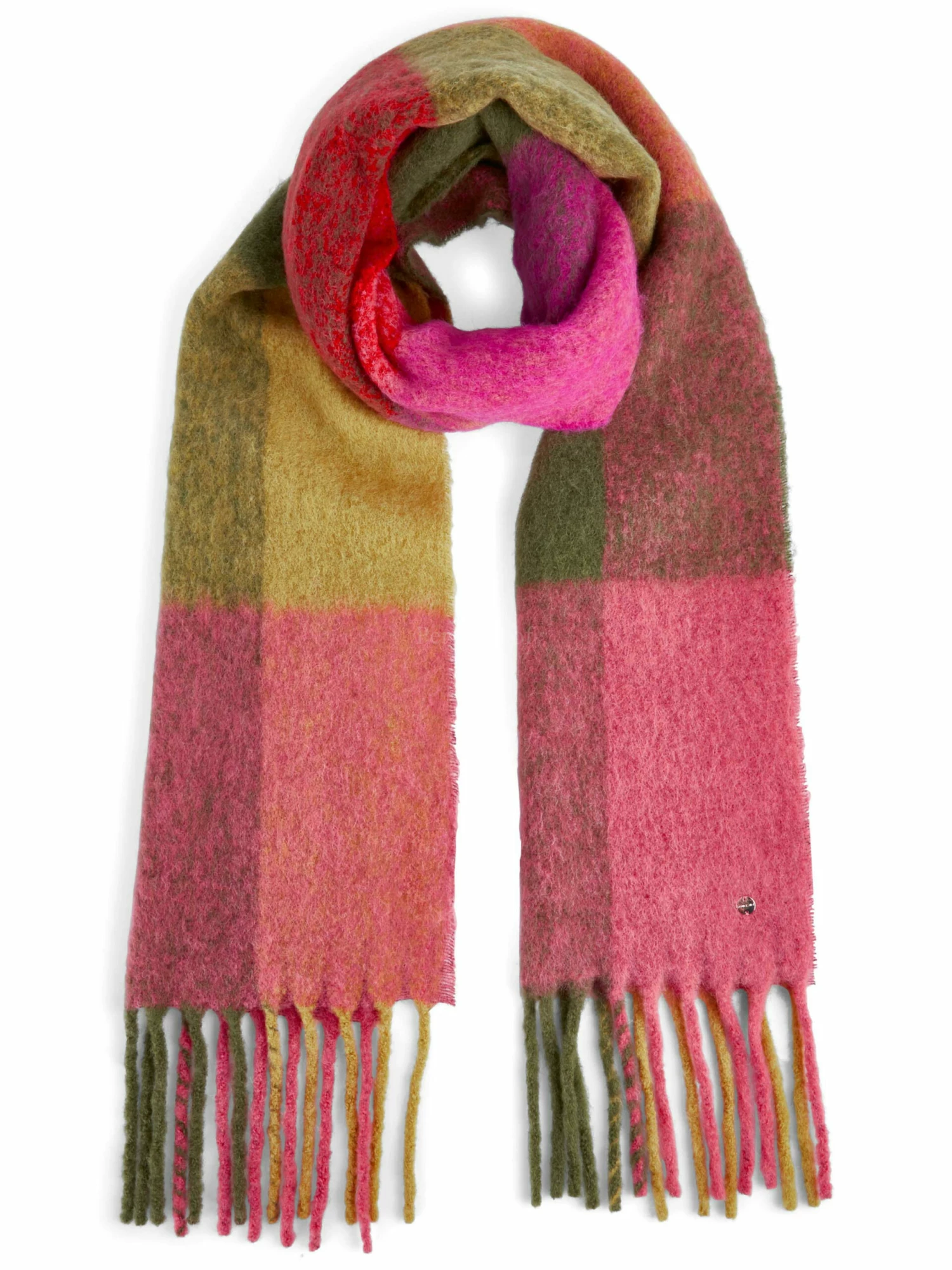 Een luxe shawl van Marc Cain in meerdere vierkante kleurvlakken gebreid met de kleuren pink, roze, fris rood, groen en lime. Aan het uiteinde van de shawl zijn lange franjes. deze shawl mag op de hand worden gewassen.