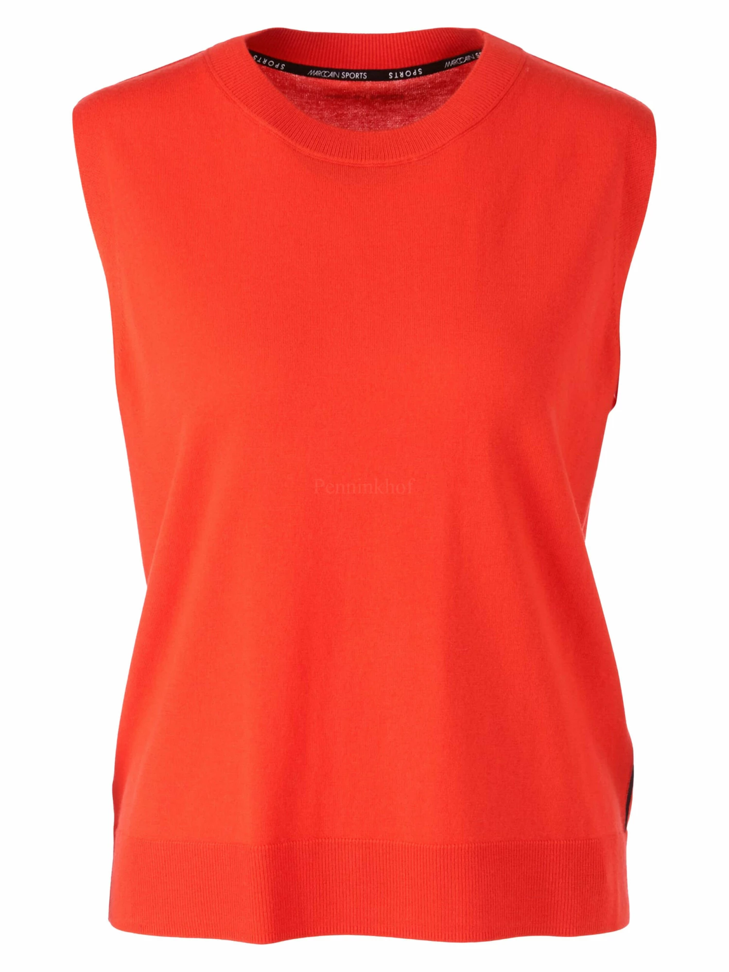 Een hes van Marc Cain in de kleur oranje. De hes heeft een ronde hals en langs de zijkanten is een zwarte bies. Dit hes mag op de hand worden gewassen.