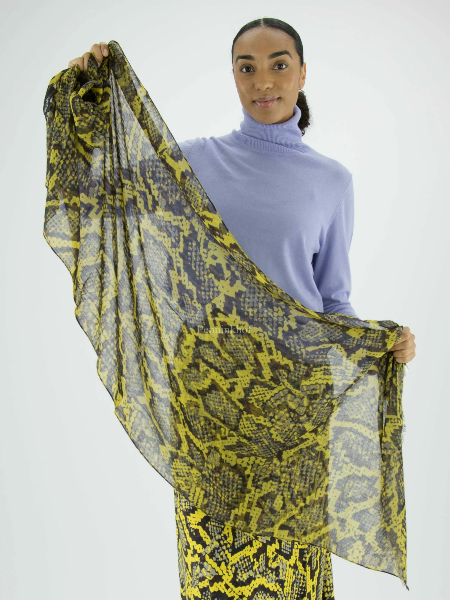 Een licht transparante shawl van Marc Cain in een reptielprint met de kleuren geel, bruin, grijs en zwart. De uitenden van de shawl zijn fijn gerafeld. Deze shawl mag op de hand worden gewassen.