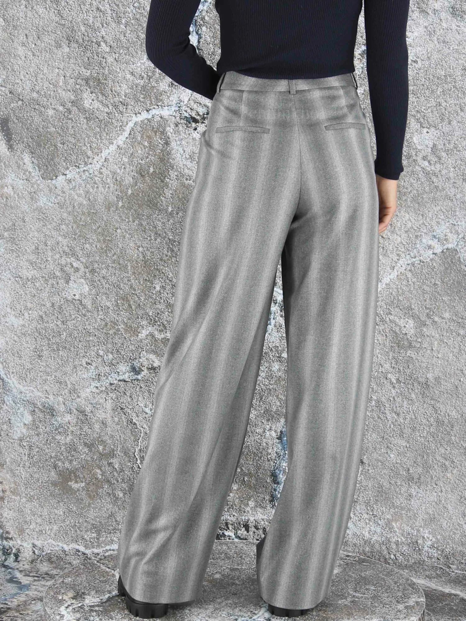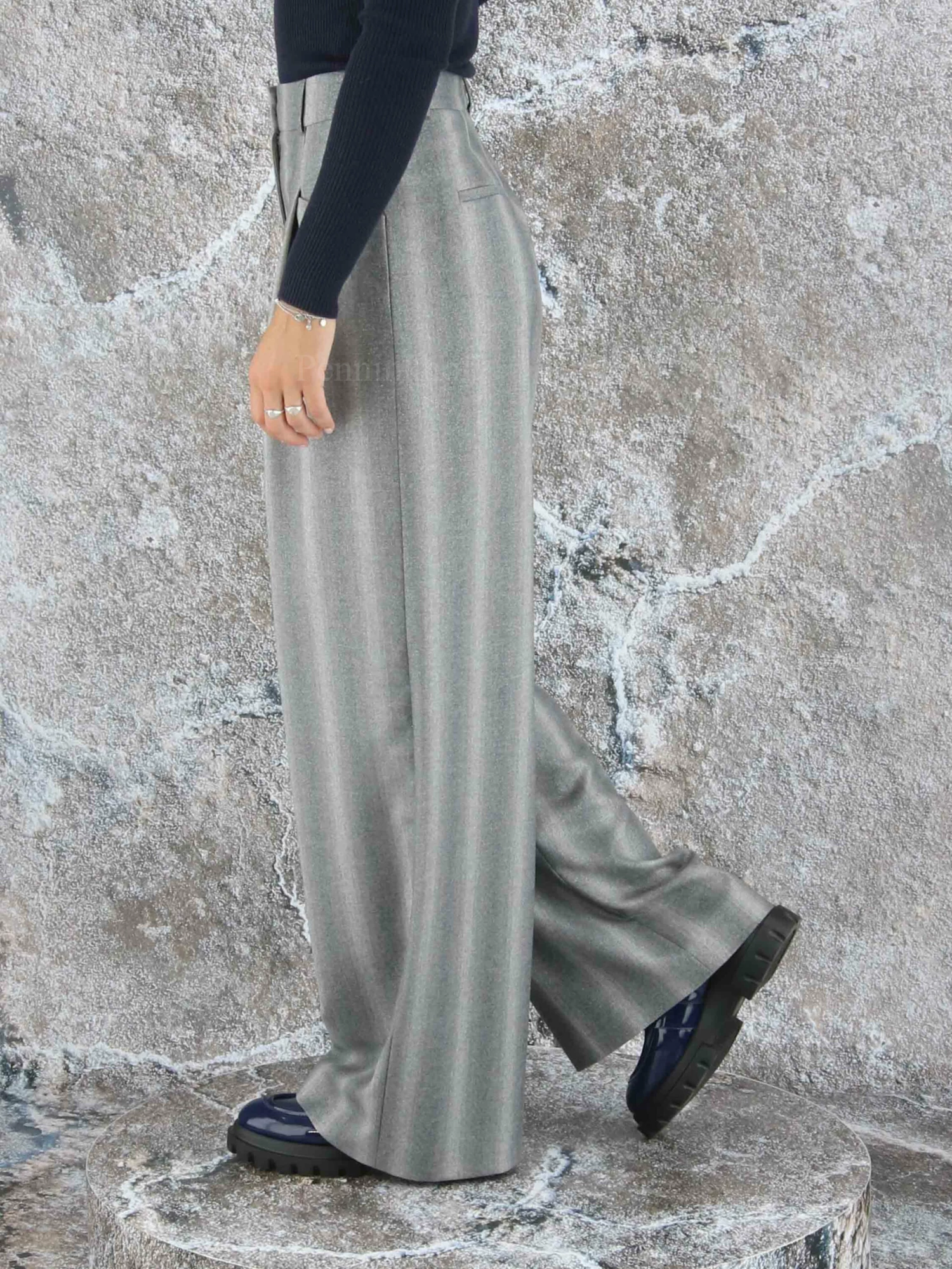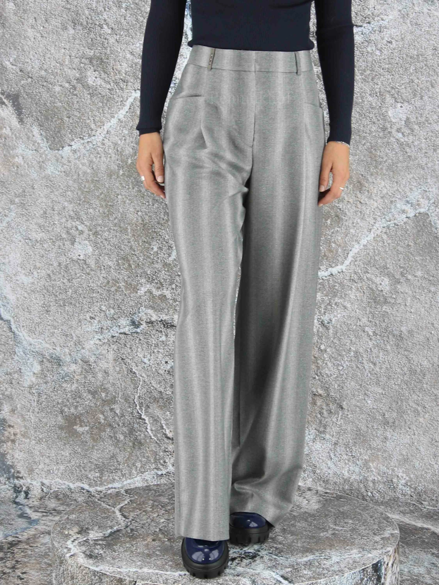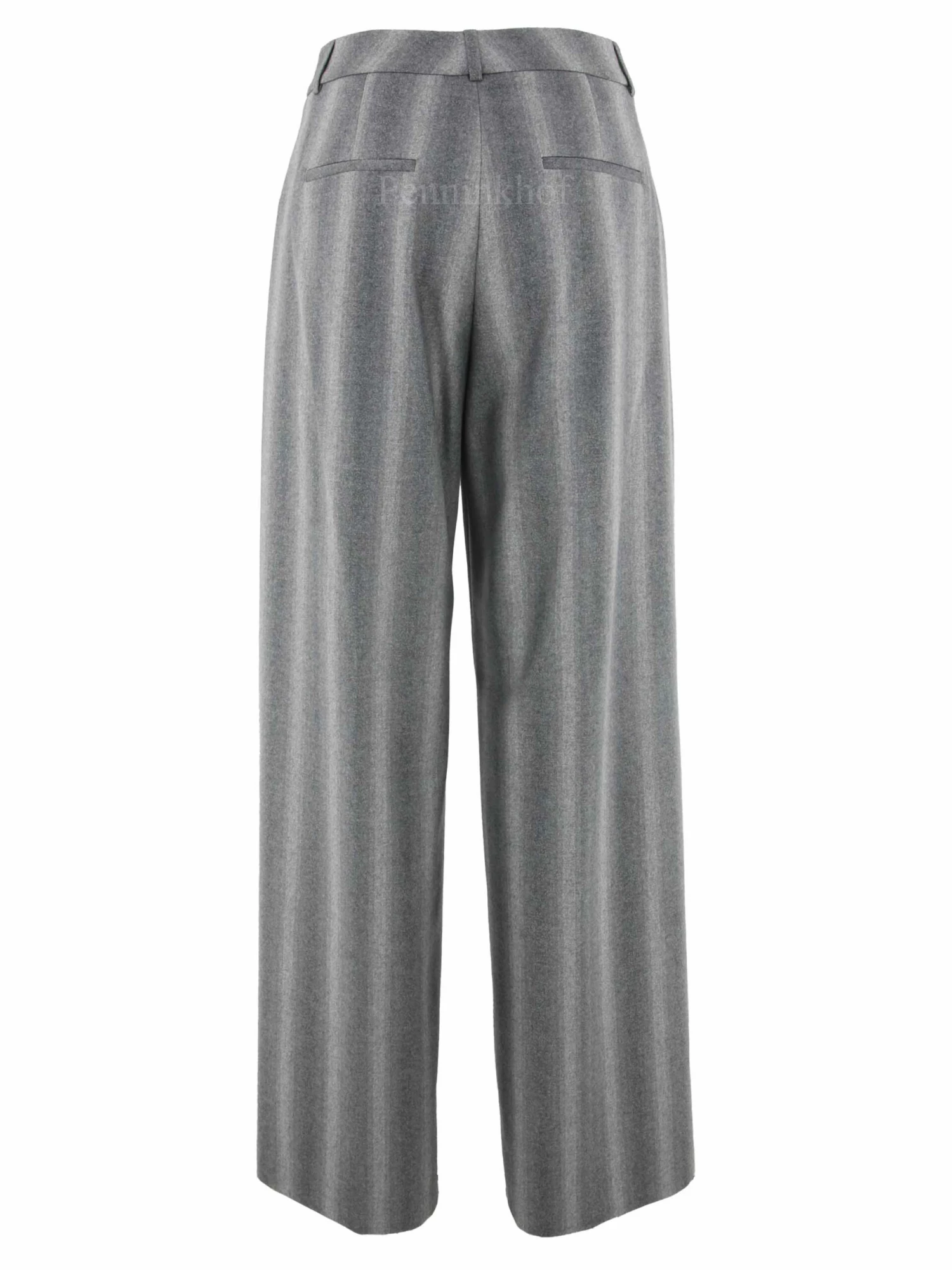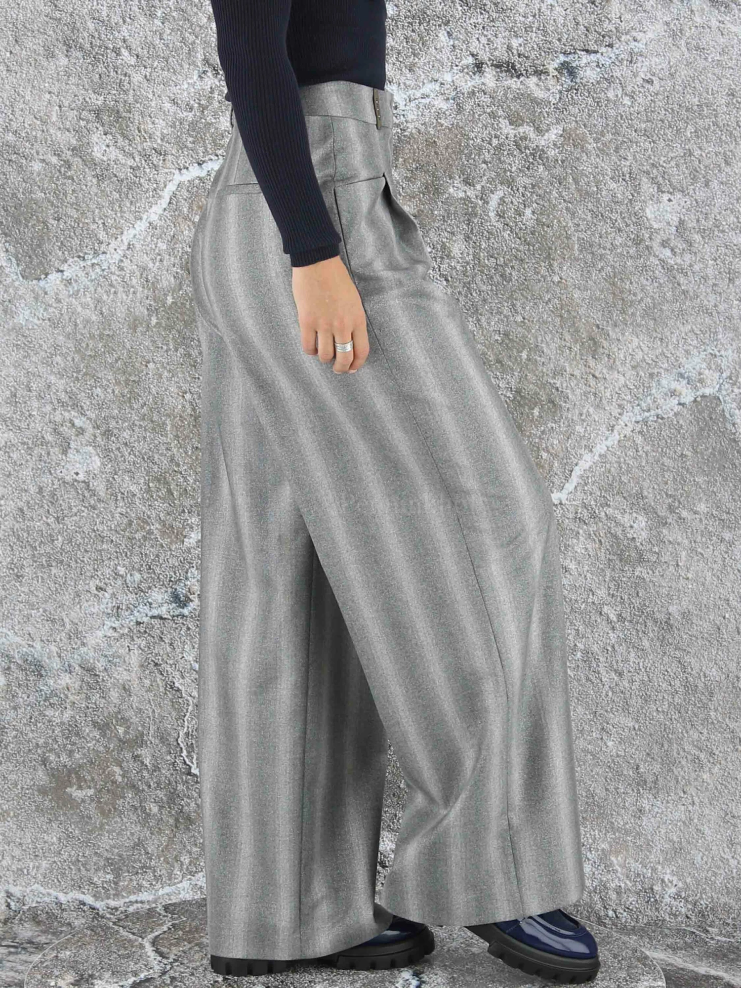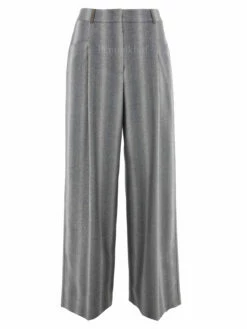 Een wijd vallende broek van Peserico in een gemêleerde strepen structuur met meerdere tinten lichtgrijs. Door de stof is een fijn zilverdraad geweven. De broek heeft 2 bandplooien die maken dat de stof van de pijpen een golvende “look” hebben. Deze broek mag niet worden gewassen.