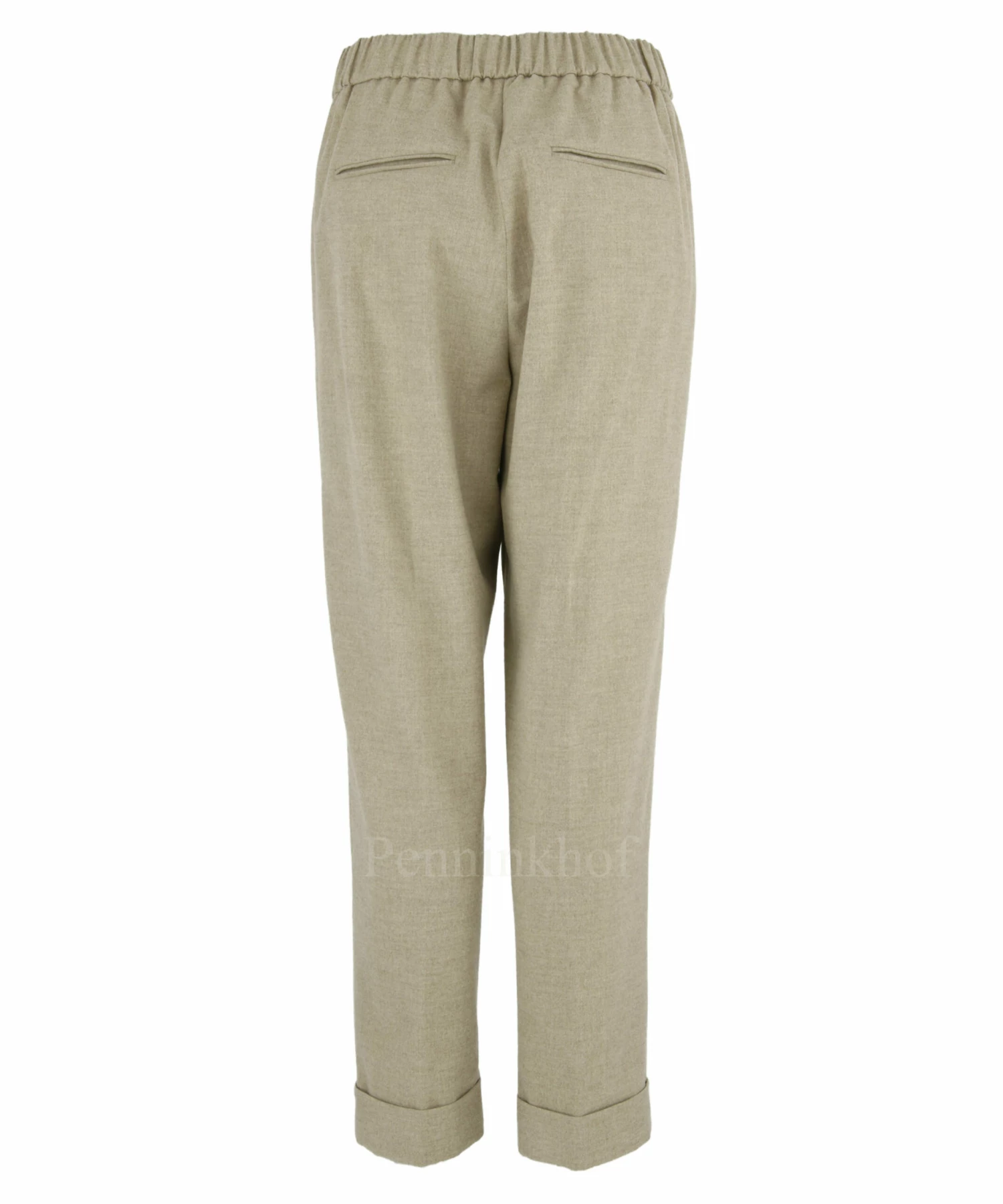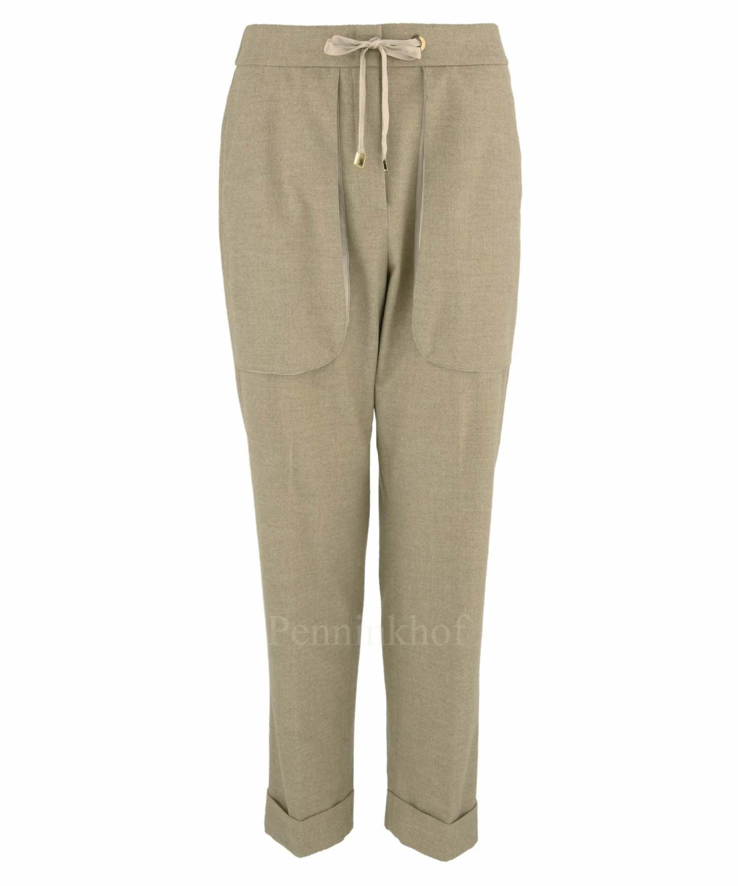 Een broek van Peserico in de kleur beige. In de taille is aan de achterkant een elastieken band. Aan de voorzijde is een koord in een tunnelverwerking. De broek heeft steekzakken met langs de randen een verborgen mat satijnen stof. Aan de onderkant van de pijpen is een omslag. Deze broek mag op 30 graden worden gewassen.