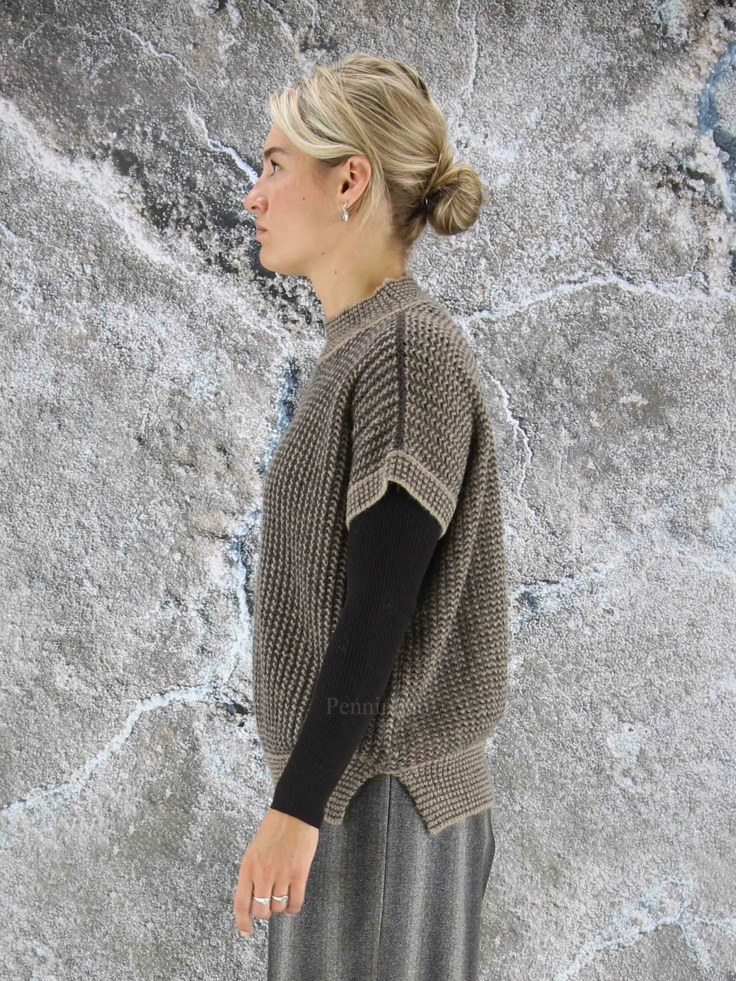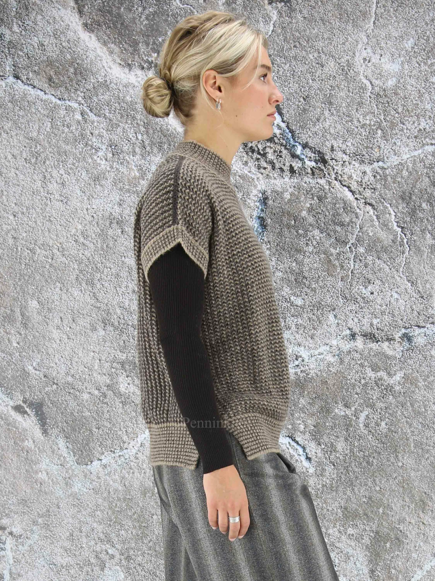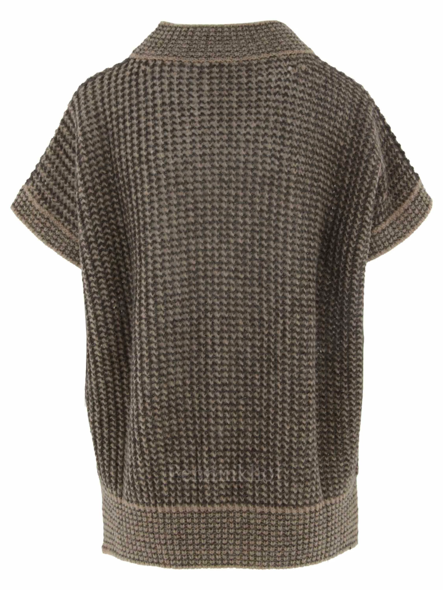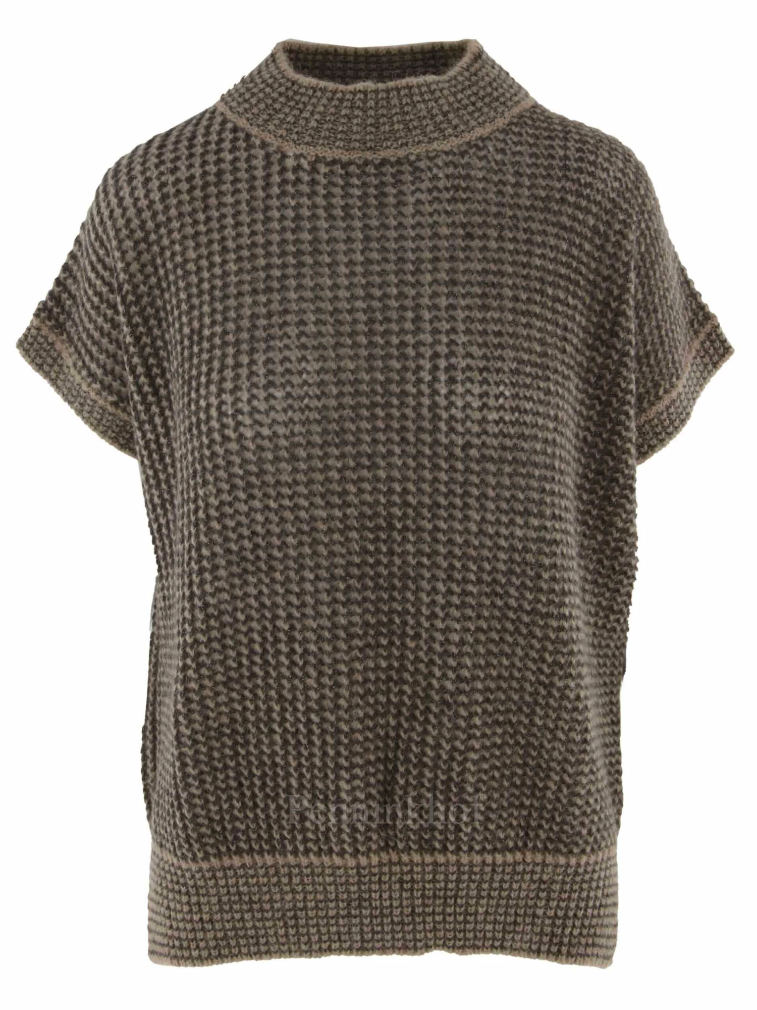 Een luxe iets open gebreid hes van Peserico in de kleuren bruin met mokkabruin. In de stof is een zilverkleurig draad geweven. Het hes heeft een hoge ronde hals en mag op de hand worden gewassen.