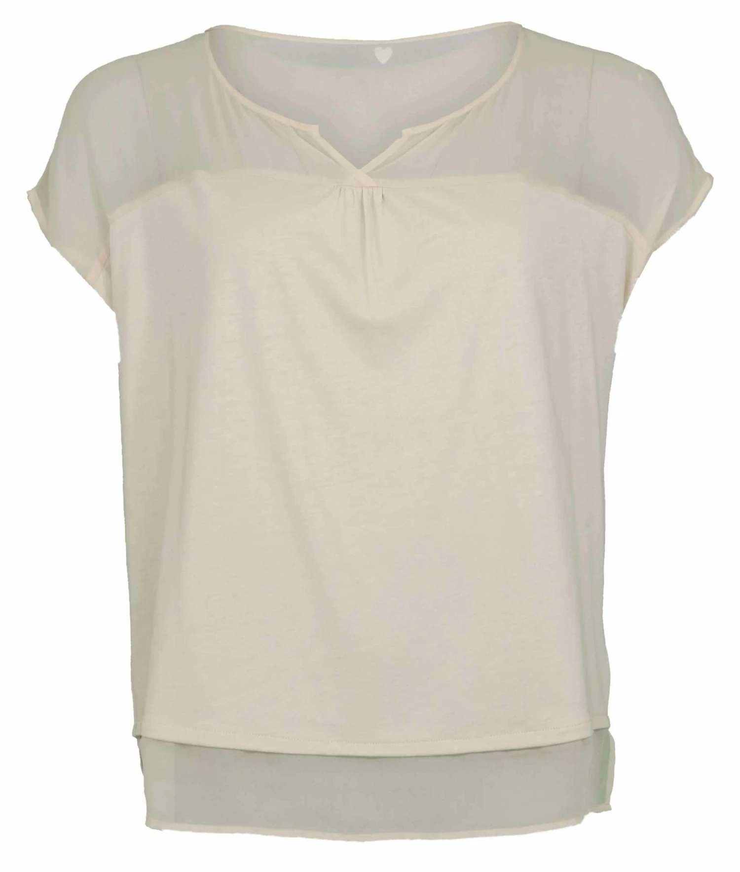 Een top van Riani in een zand kleur. Boven de buste is de top transparant. De ronde hals heeft in het midden een kleine uitsnijding. Aan de onderzijde is een voile boord. Deze top mag op de hand worden gewassen.